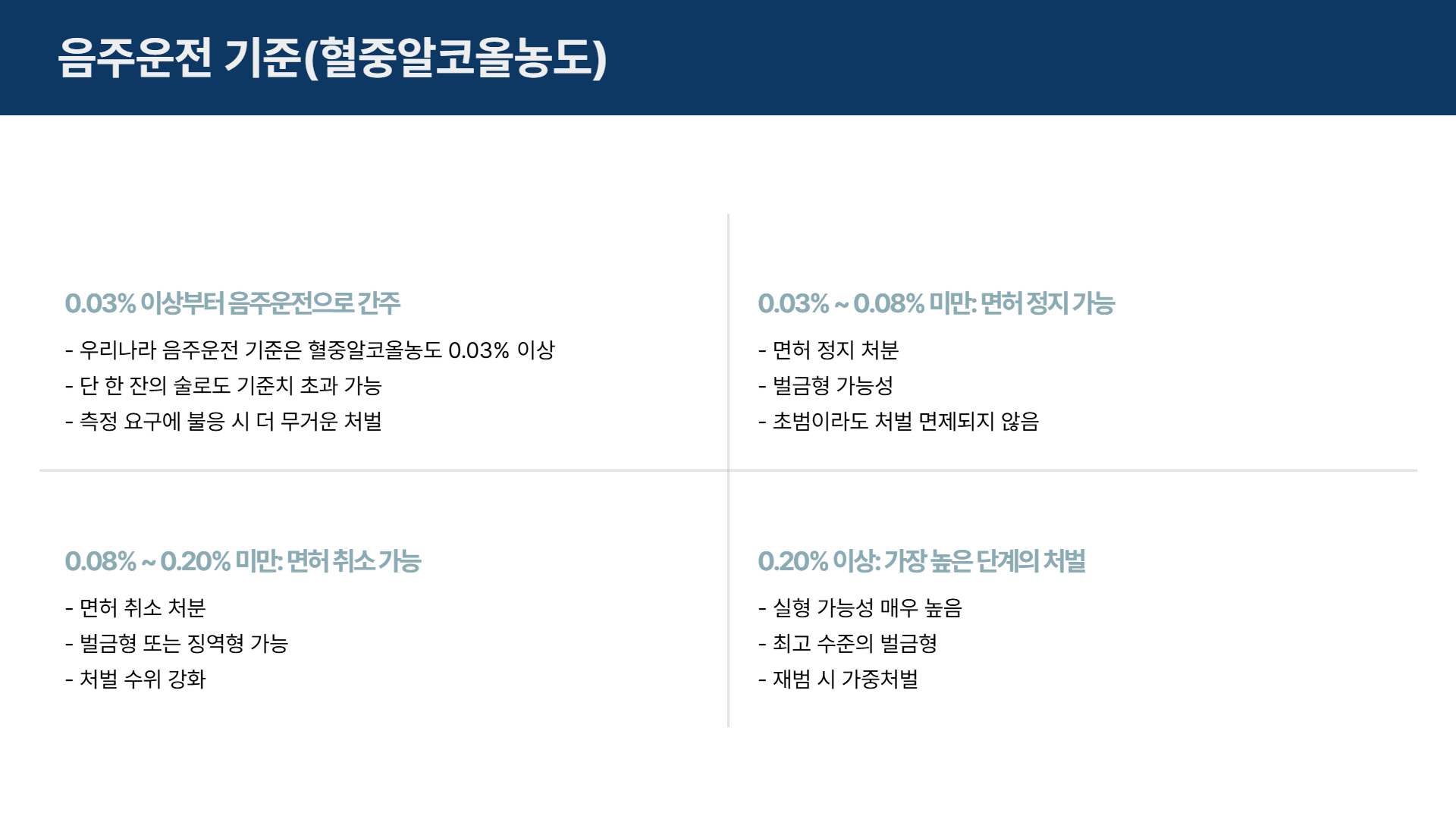 우리나라 음주운전 기준은 혈중알코올농도 0.03% 이상부터 음주운전으로 간주됩니다. 수치가 올라갈수록 처벌의 강도도 높아집니다.