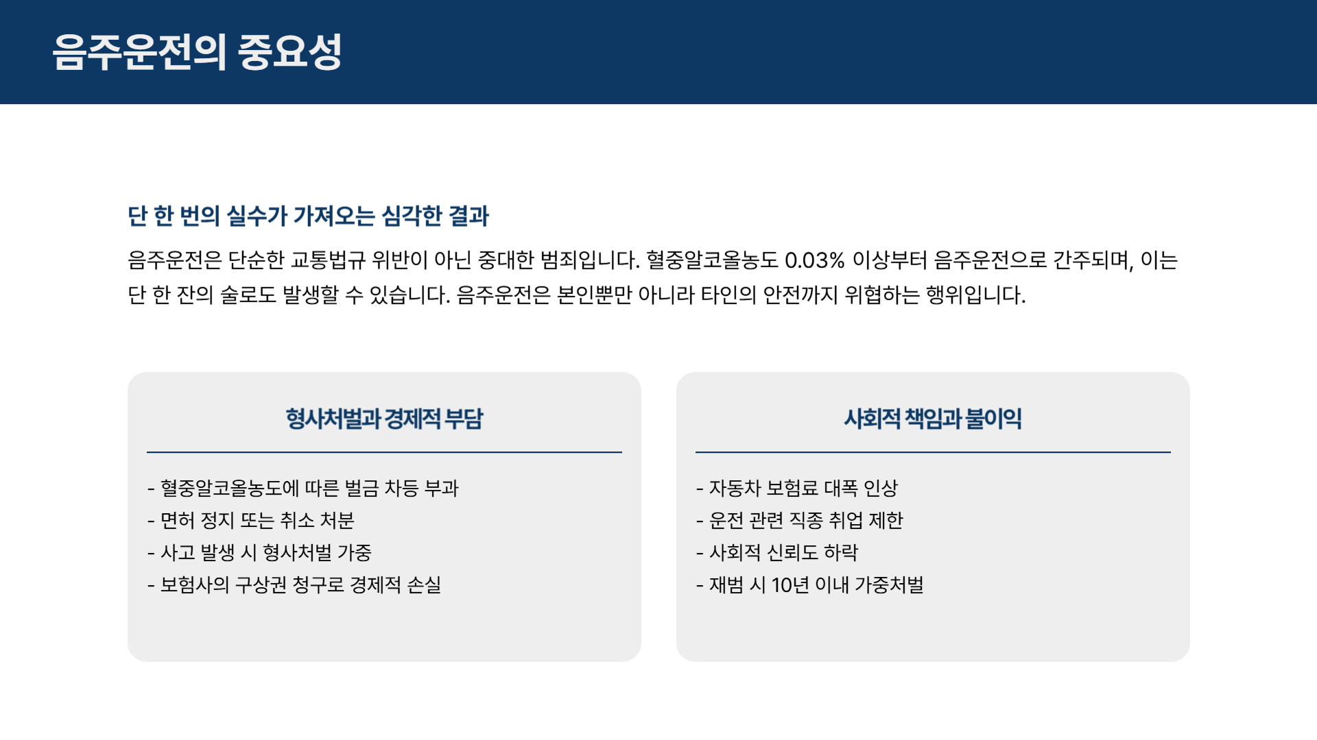 음주운전 처벌 기준은 매우 엄격하며, 벌금 역시 상황에 따라 500만 원 이하에서 시작해 1,000만 원, 2,000만 원, 심하면 3,000만 원 이상까지 증가할 수 있습니다. 여기에 면허 취소, 보험료 인상, 실형 가능성까지 고려하면 음주운전이 남기는 피해는 단순한 법적 책임을 넘어 삶 전체에 장기적인 영향을 미치게 됩니다.