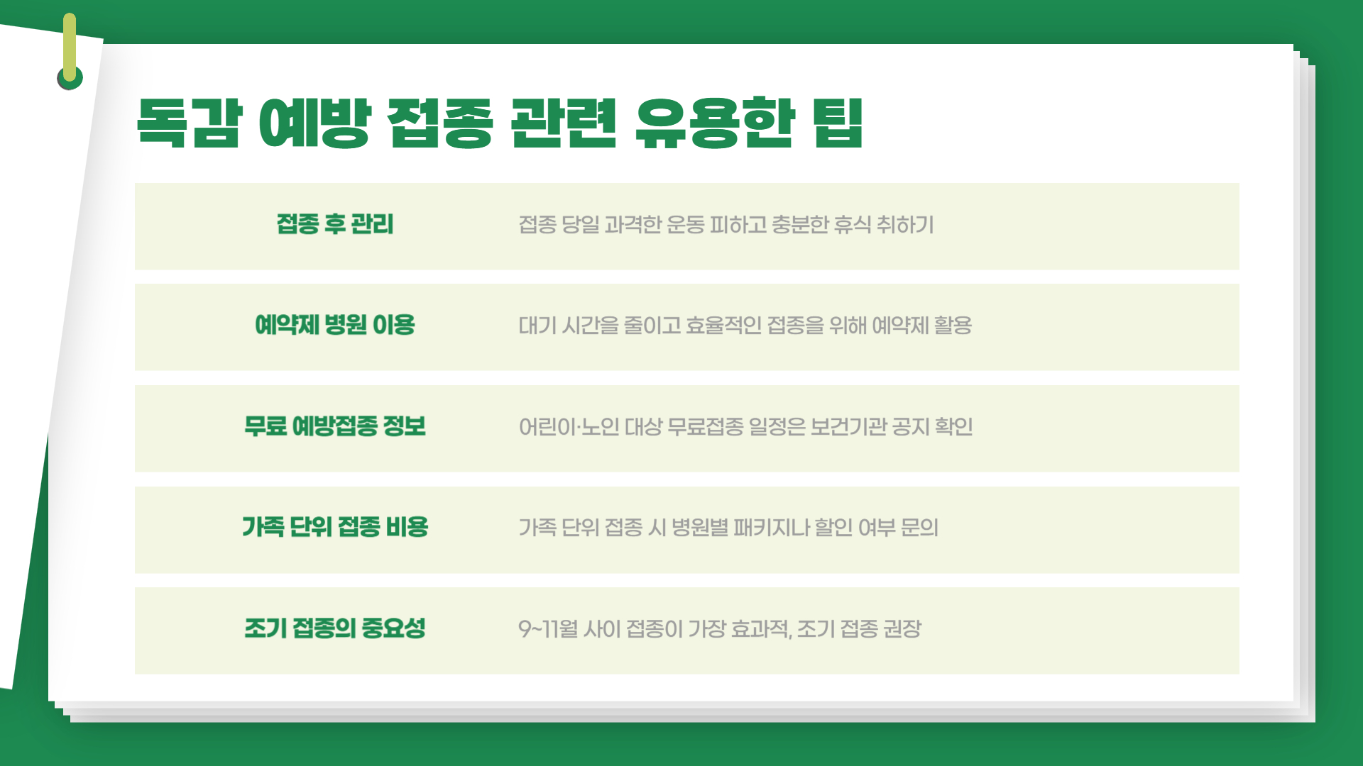 - 어린이·노인 대상의 무료 예방접종 일정은 매년 다르므로 보건기관 공지를 확인