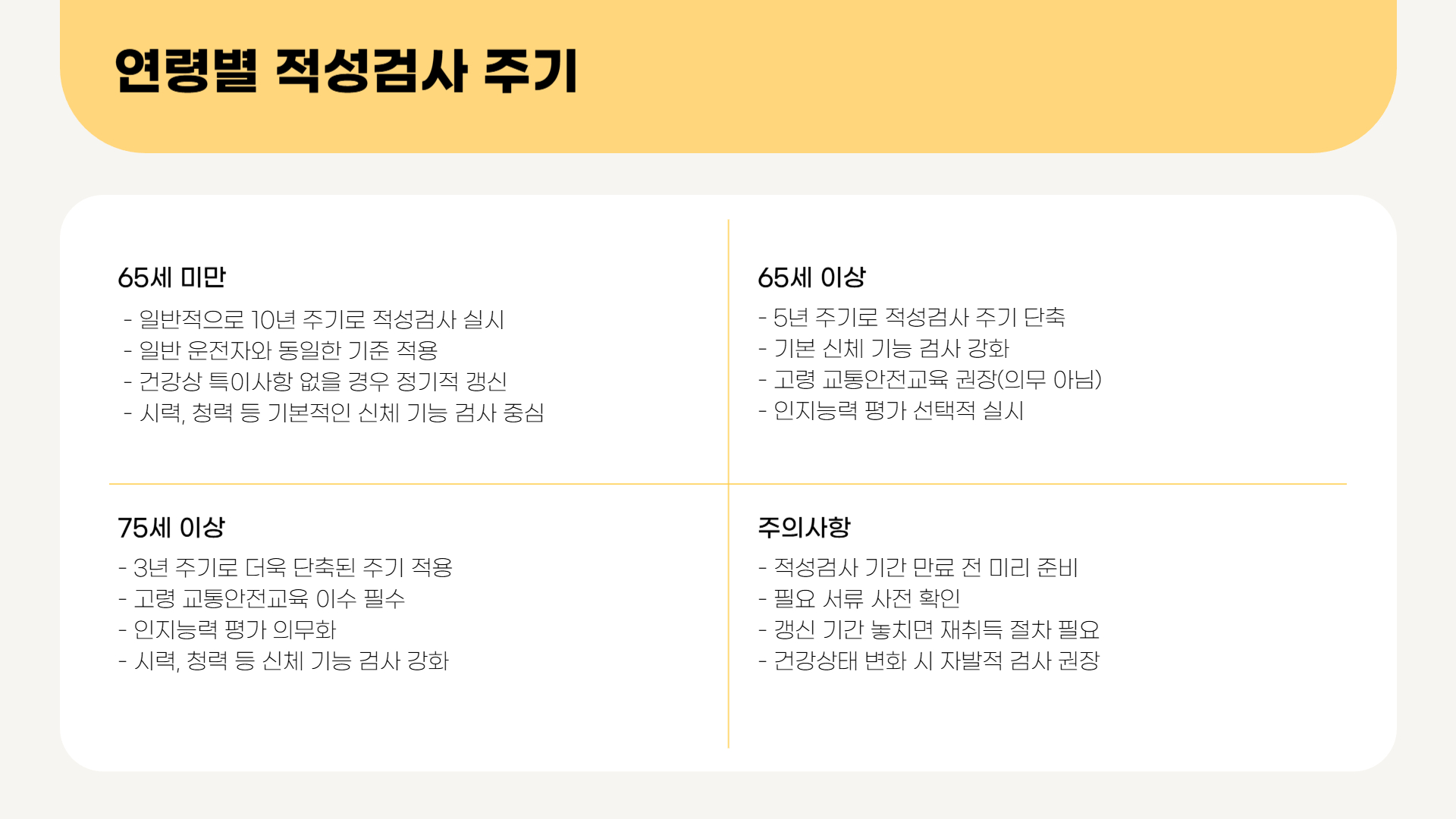 - 75세 이상은 기본적인 교육 프로그램 이수 및 고령 교통안전교육 참여가 필수입니다.