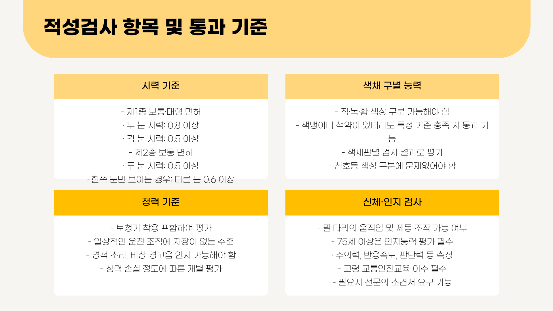 - 보청기 포함하여 일상적인 운전 조작에 지장이 없는 수준이어야 합니다.