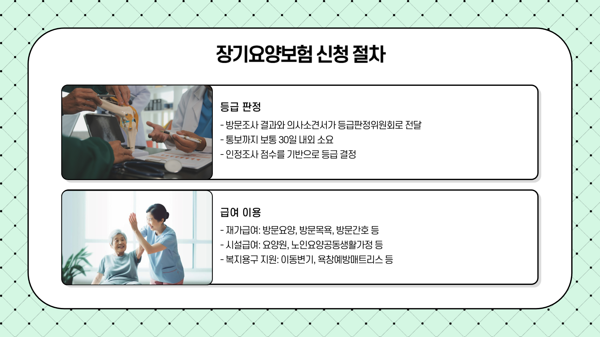 이러한 항목들의 점수가 점수화되어 등급이 결정되며, 등급이 높을수록 받을 수 있는 서비스 양과 범위가 넓어집니다.