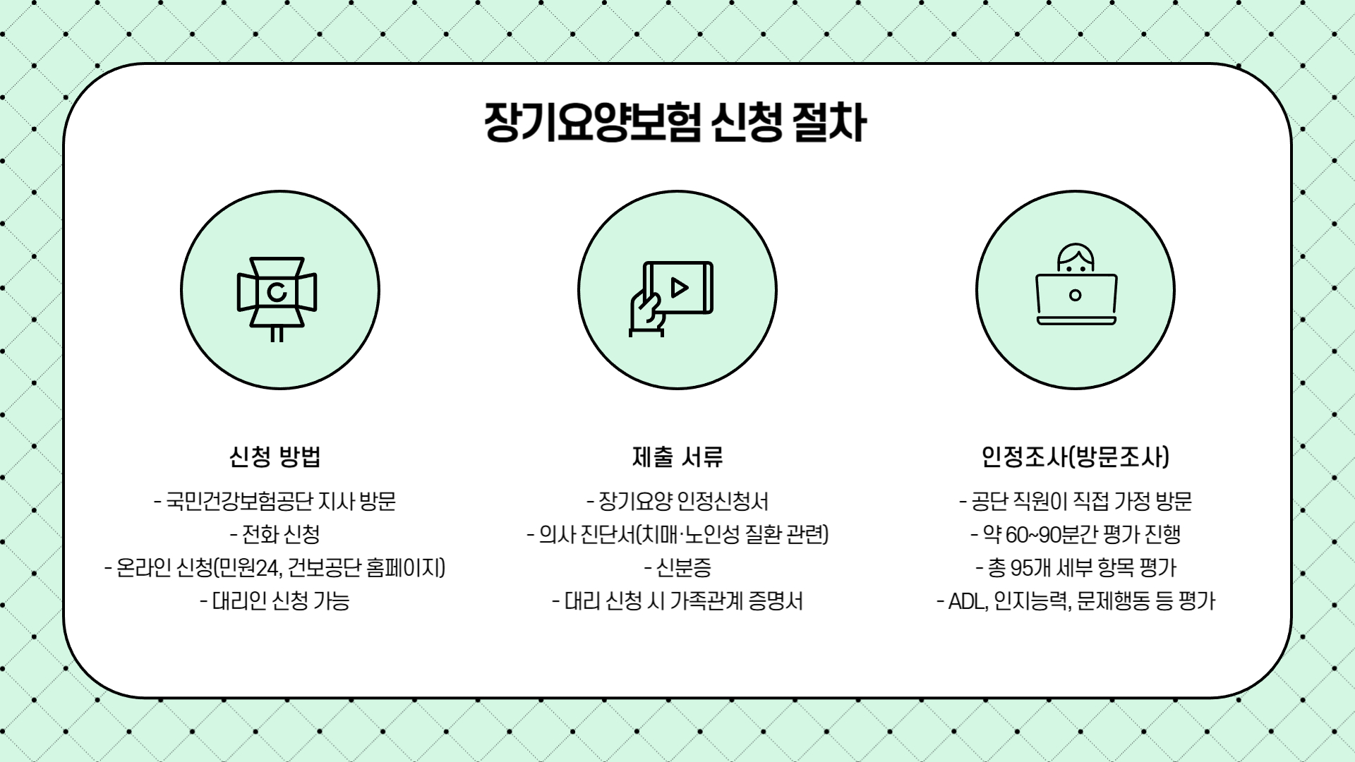 장기요양보험 신청은 국민건강보험공단 지사 방문·전화·온라인(민원24·건보공단 홈페이지) 중 편한 방식으로 진행할 수 있습니다.
