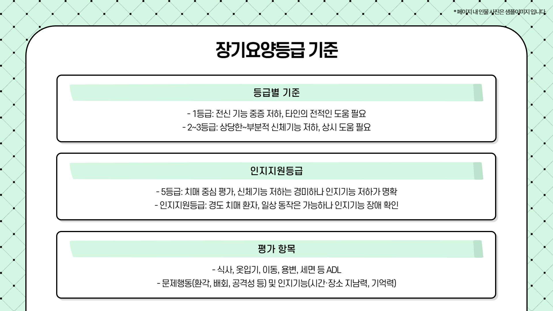 - 5등급: 치매 중심 평가. 신체기능 저하는 경미하지만 인지기능 저하가 명확한 경우