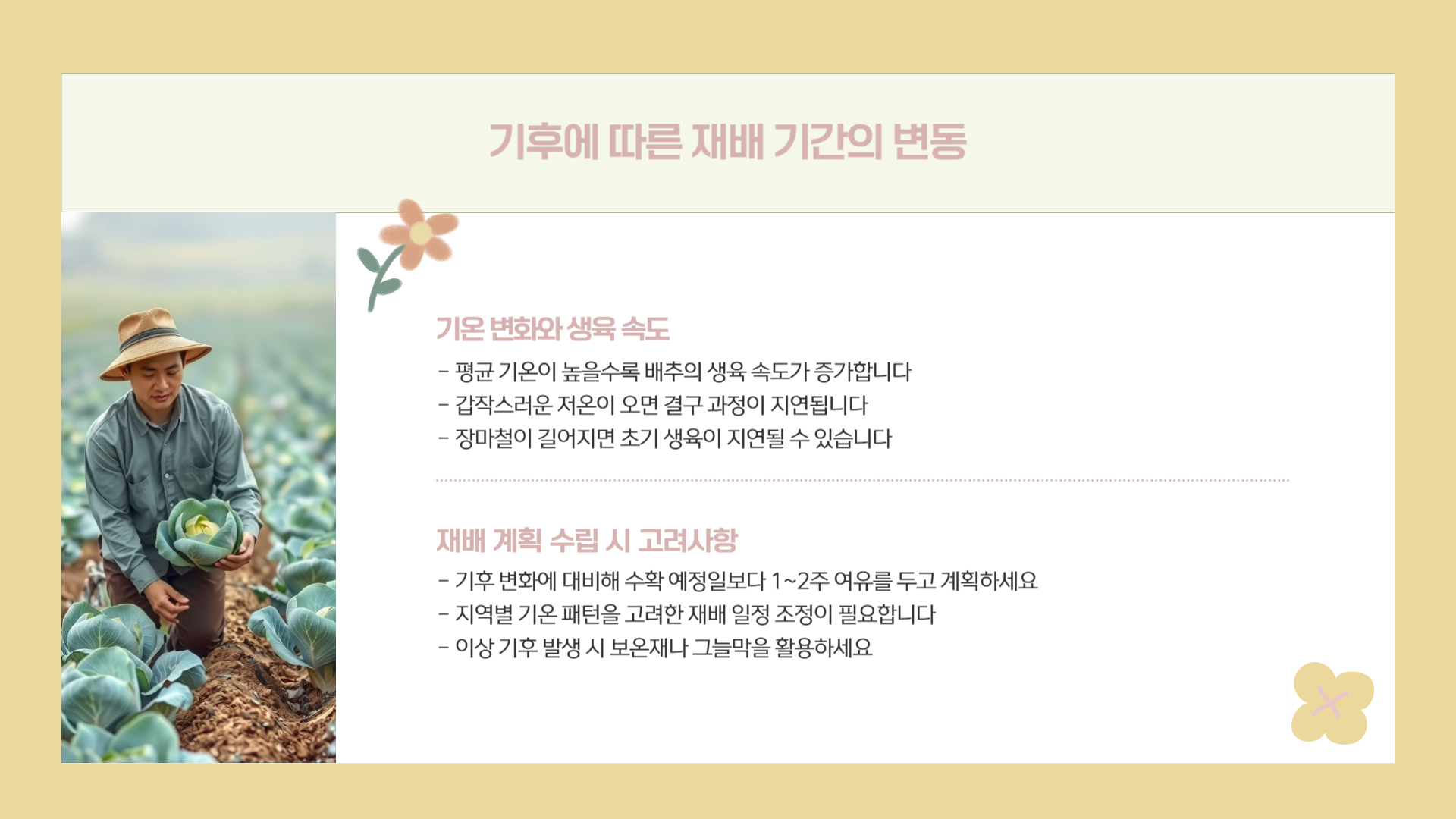 - 갑작스러운 저온이 오면 결구가 늦어짐 → 수확 시점이 뒤로 밀림