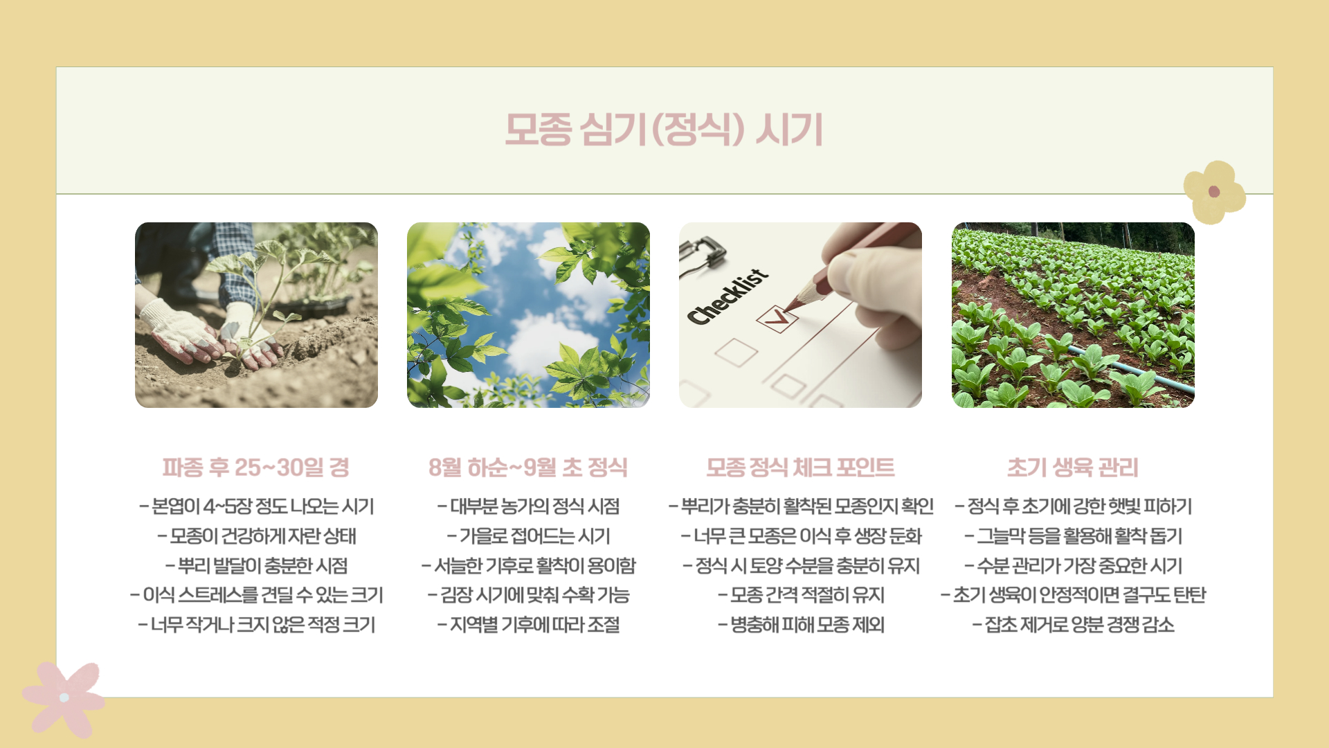 모종 정식 시 중요한 체크 포인트는 다음과 같습니다.