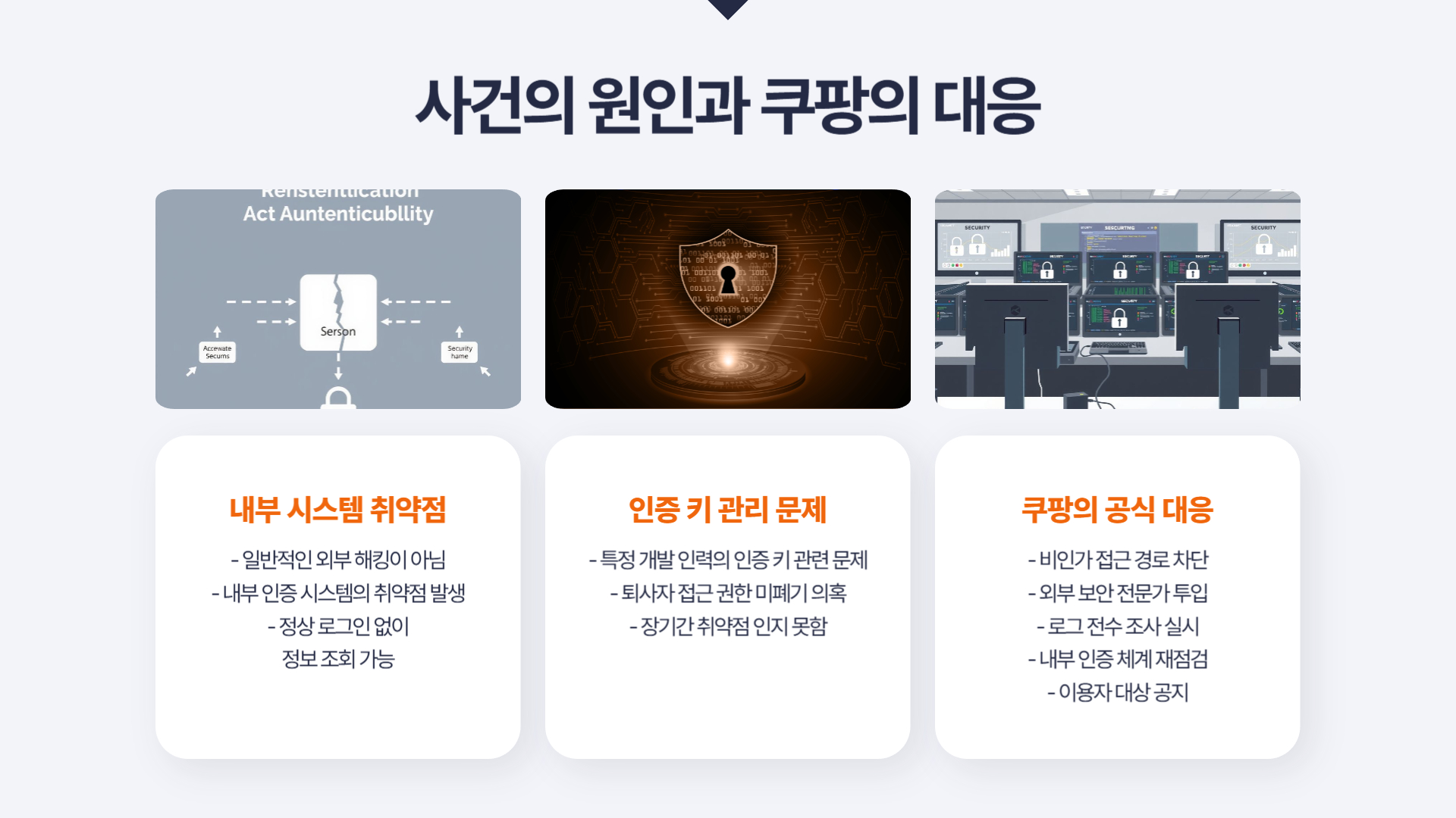 이번 사건의 중요한 특징은, 일반적으로 흔히 말하는 ‘외부 해킹’이 아니라는 점입니다. 유출은 내부 인증 시스템에서 발생한 취약점과 관련이 있었으며, 특정 개발 인력이 보유했던 인증 키가 사고의 매개가 된 것으로 알려졌습니다. 이 인증 키를 통해 정상적인 로그인 절차 없이 회원 정보를 조회할 수 있었고, 허점이 장기간 인지되지 못해 유출 규모가 확대된 것으로 파악됩니다.