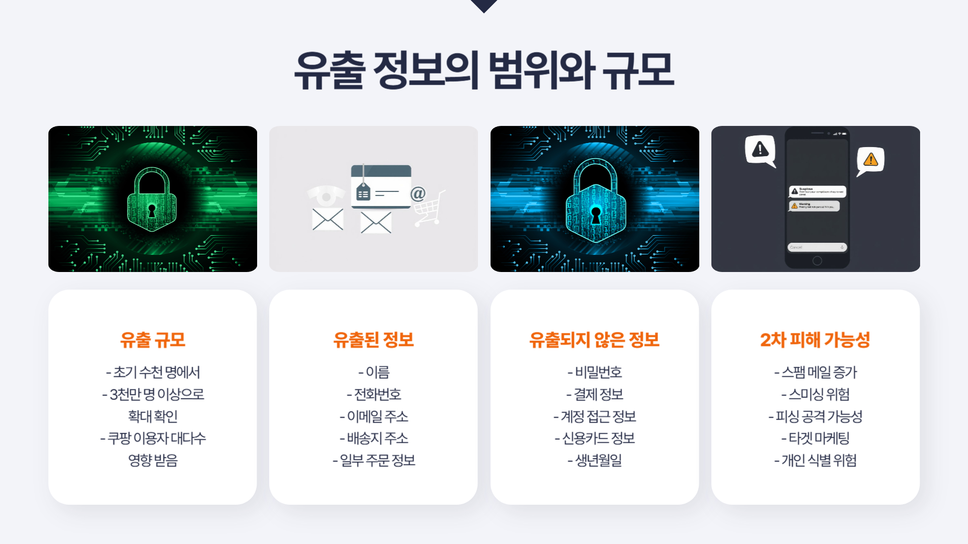 비밀번호, 결제 정보, 계정 접근 정보 등은 유출되지 않았다는 것이 쿠팡의 공식 입장입니다. 그러나 기본 신상 정보와 주소·연락처가 포함되었다는 점에서 스팸, 스미싱, 피싱 등 2차 피해 가능성이 우려되고 있습니다.