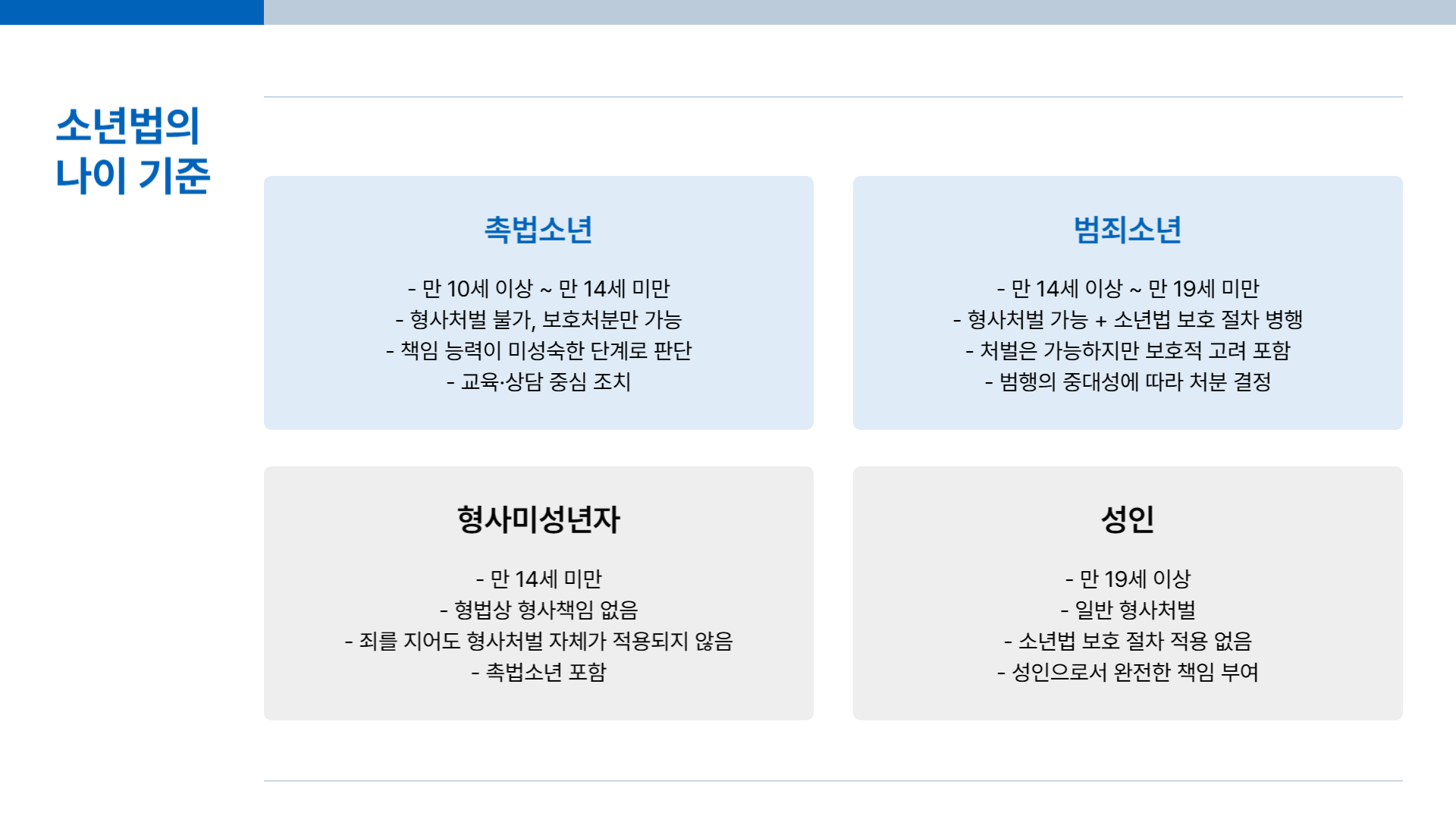 | 범죄소년 | 만 14세 이상 ~ 만 19세 미만 | 형사처벌 가능 + 소년법 보호 절차 병행 | 처벌은 가능하지만 보호적 고려 포함해 판단 |