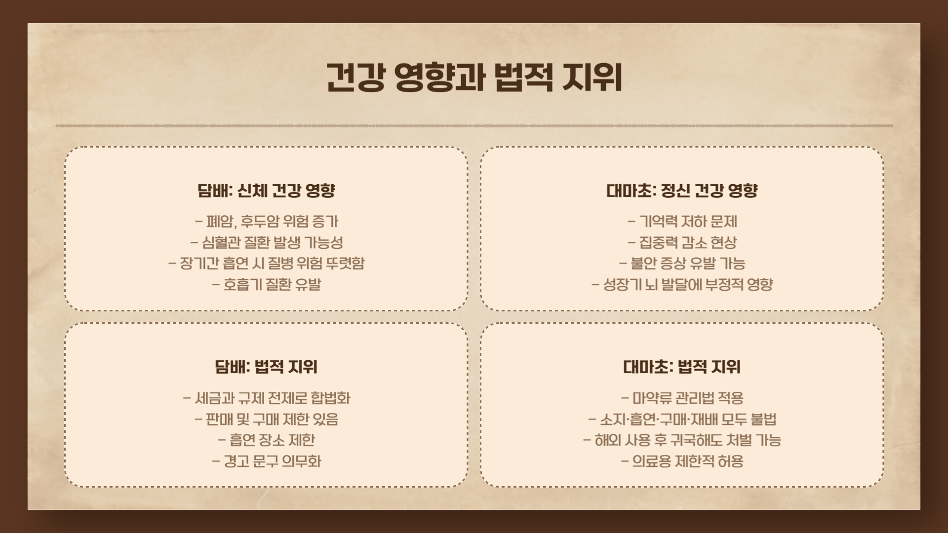 즉, 담배는 일상적인 기호품의 성격이 강한 반면, 대마초는 향정신성 물질로 분류된다는 점에서 출발선이 다릅니다.