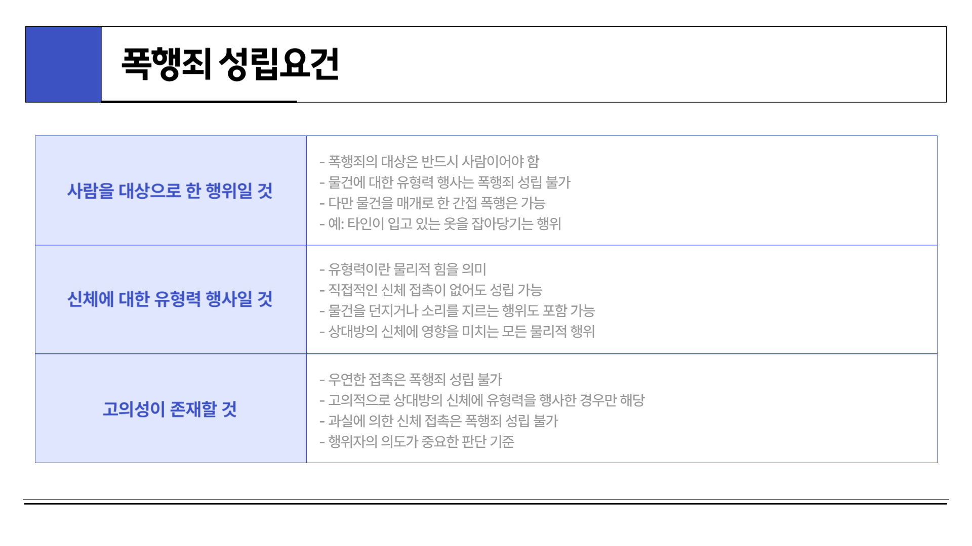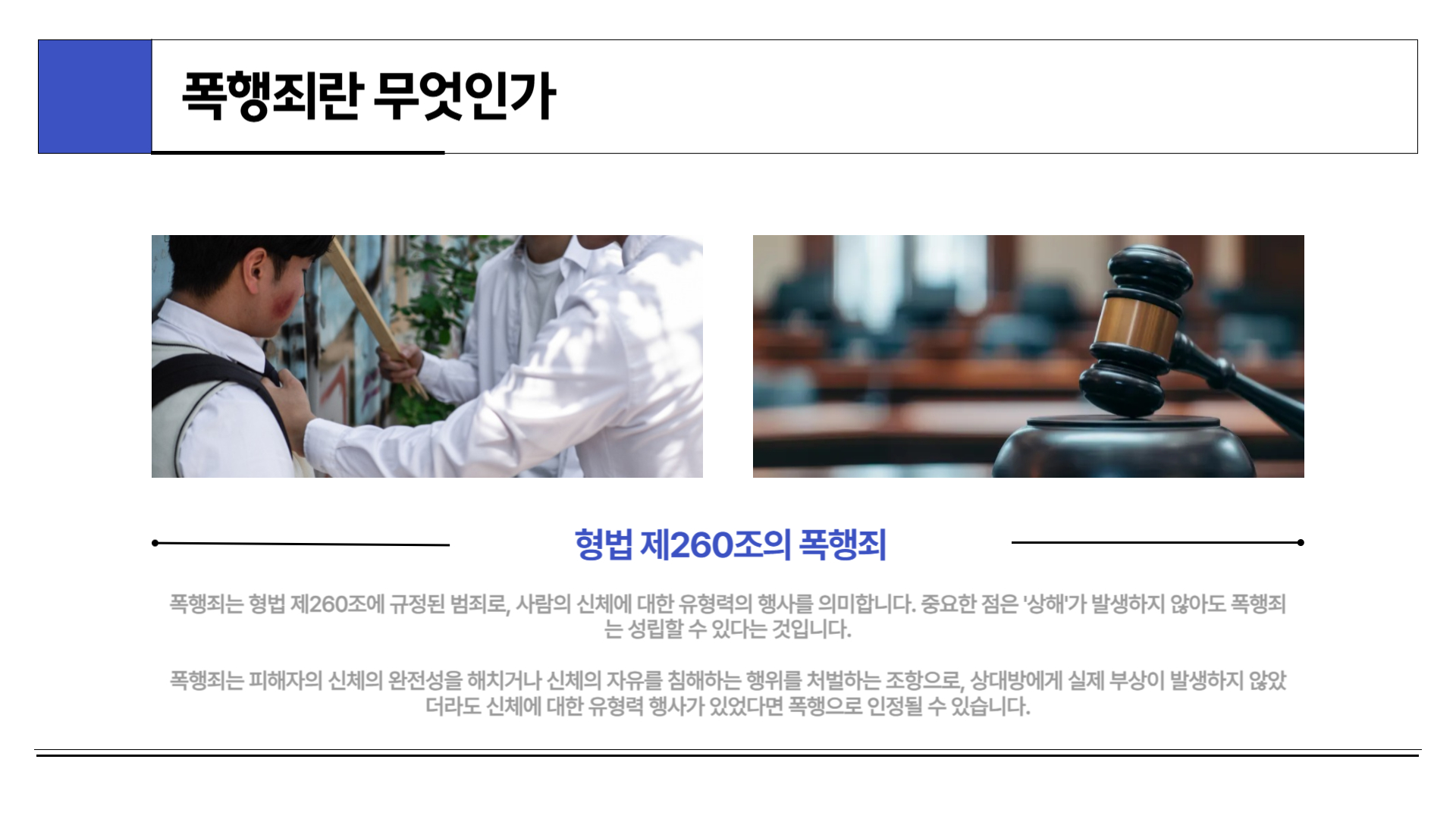 - 폭행죄: 상해 결과 없으나, 신체에 대한 유형력 행사