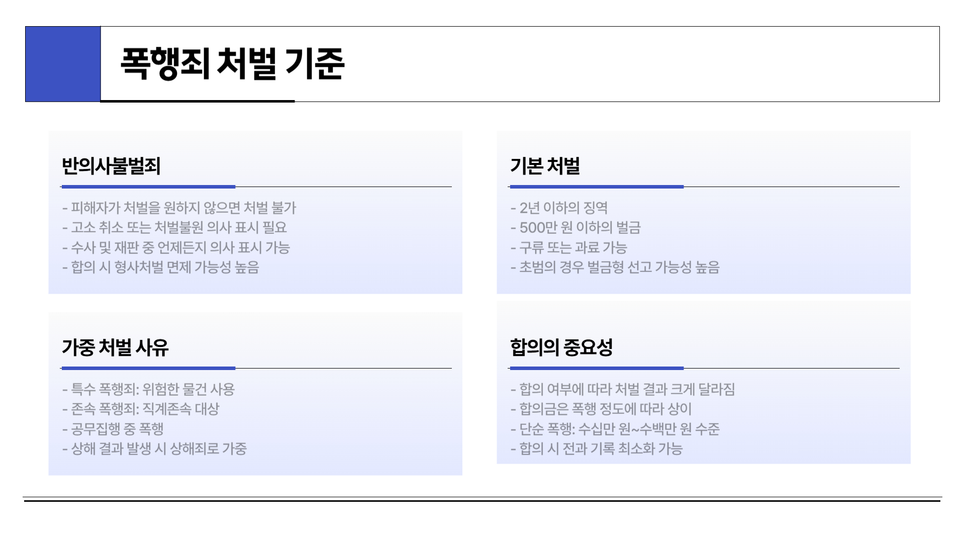 이 글을 통해 폭행죄의 성립요건, 처벌 기준, 합의금에 대한 기본적인 틀을 이해하는 데 도움이 되셨기를 바랍니다. 감정적인 대응보다 법적 기준에 따른 냉정한 판단이 가장 현명한 선택이 될 수 있습니다.