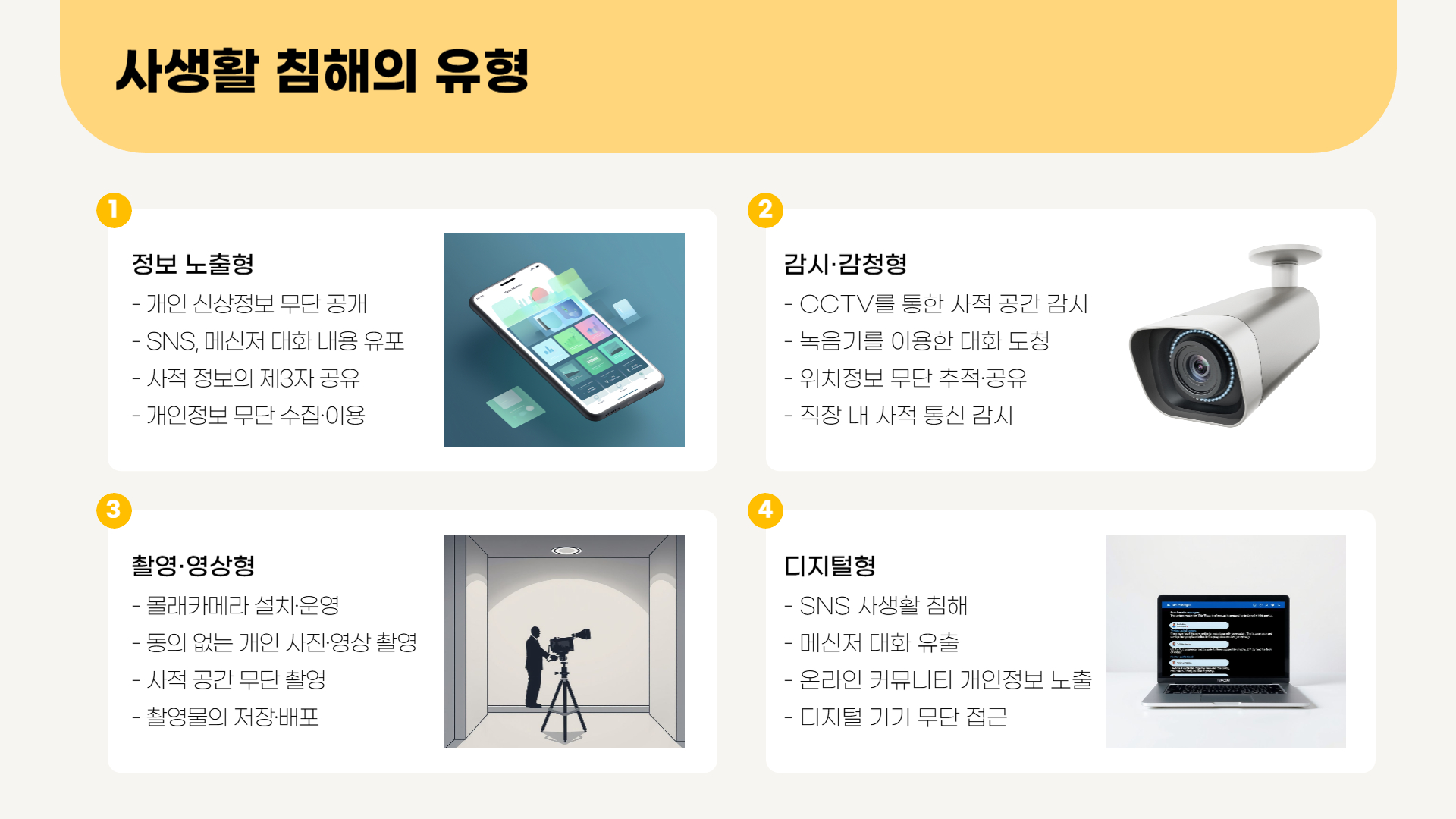 사생활 침해는 유형별로 나누어 이해할 수 있습니다.