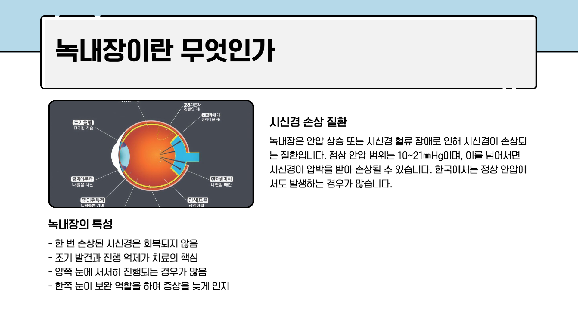 녹내장은 완치보다는 진행을 늦추는 질환입니다. 조기에 발견할수록 평생 시력을 유지할 가능성이 높아집니다.