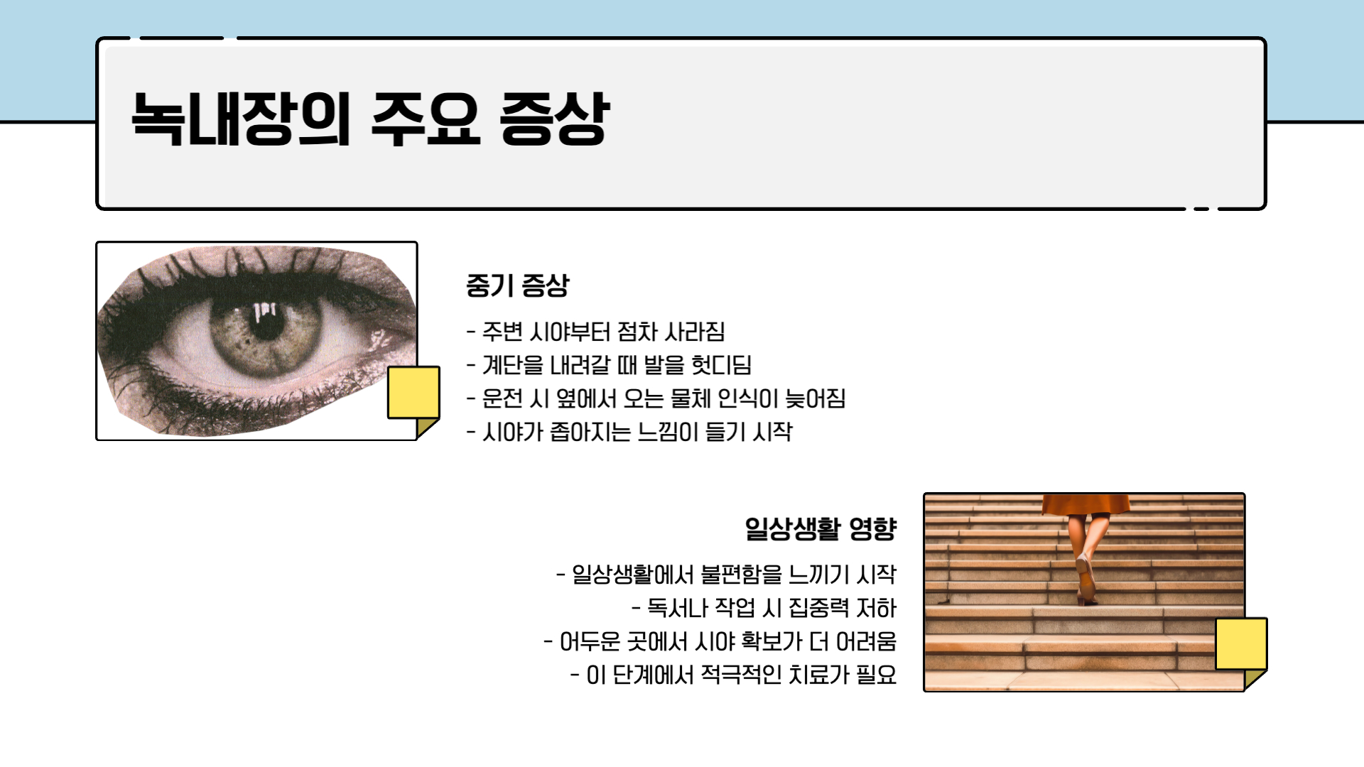 - 주변 시야부터 점차 사라짐