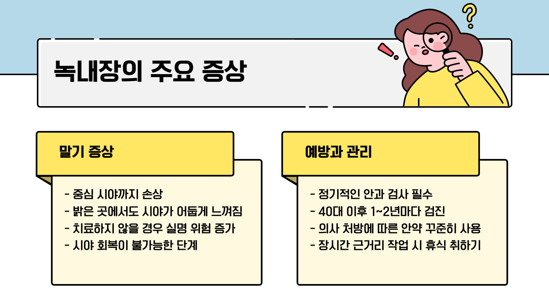 - 정기적인 안과 검사(안압·시야 검사)