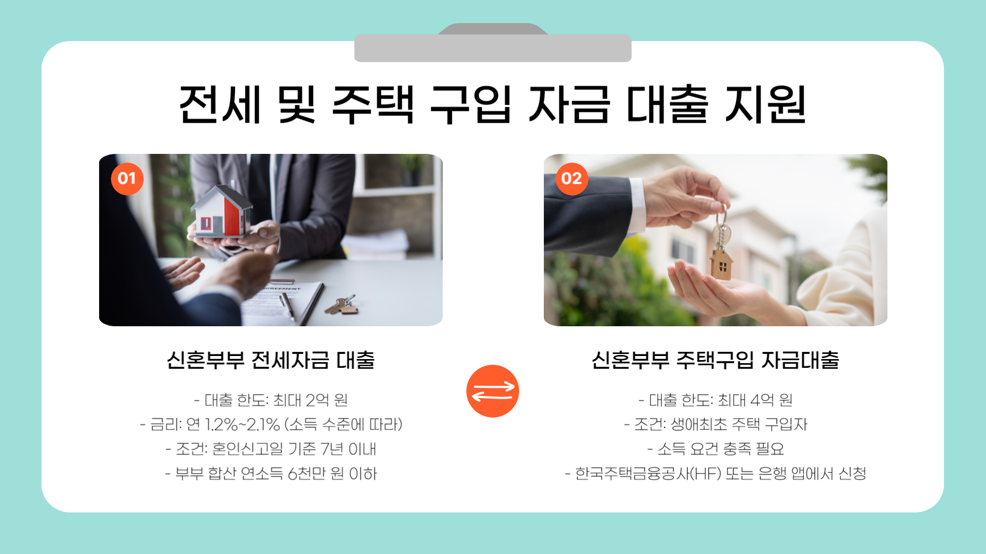 - 조건: 혼인신고일 기준 7년 이내, 부부 합산 연소득 6천만 원 이하