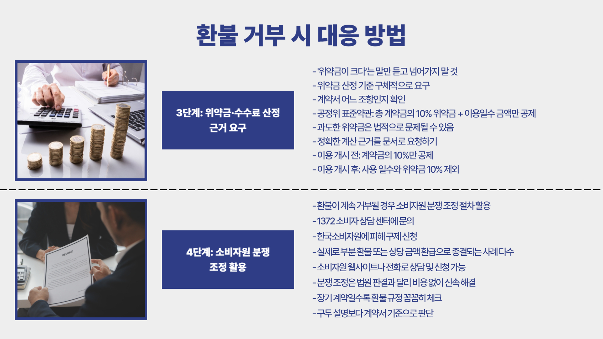다만, 위약금이 과도하거나 환불 자체를 전면 거부하는 조항은 문제가 될 수 있습니다. 계약서에 “환불 불가”라고 적혀 있더라도, 모든 조항이 무조건 효력이 있는 것은 아닙니다.
