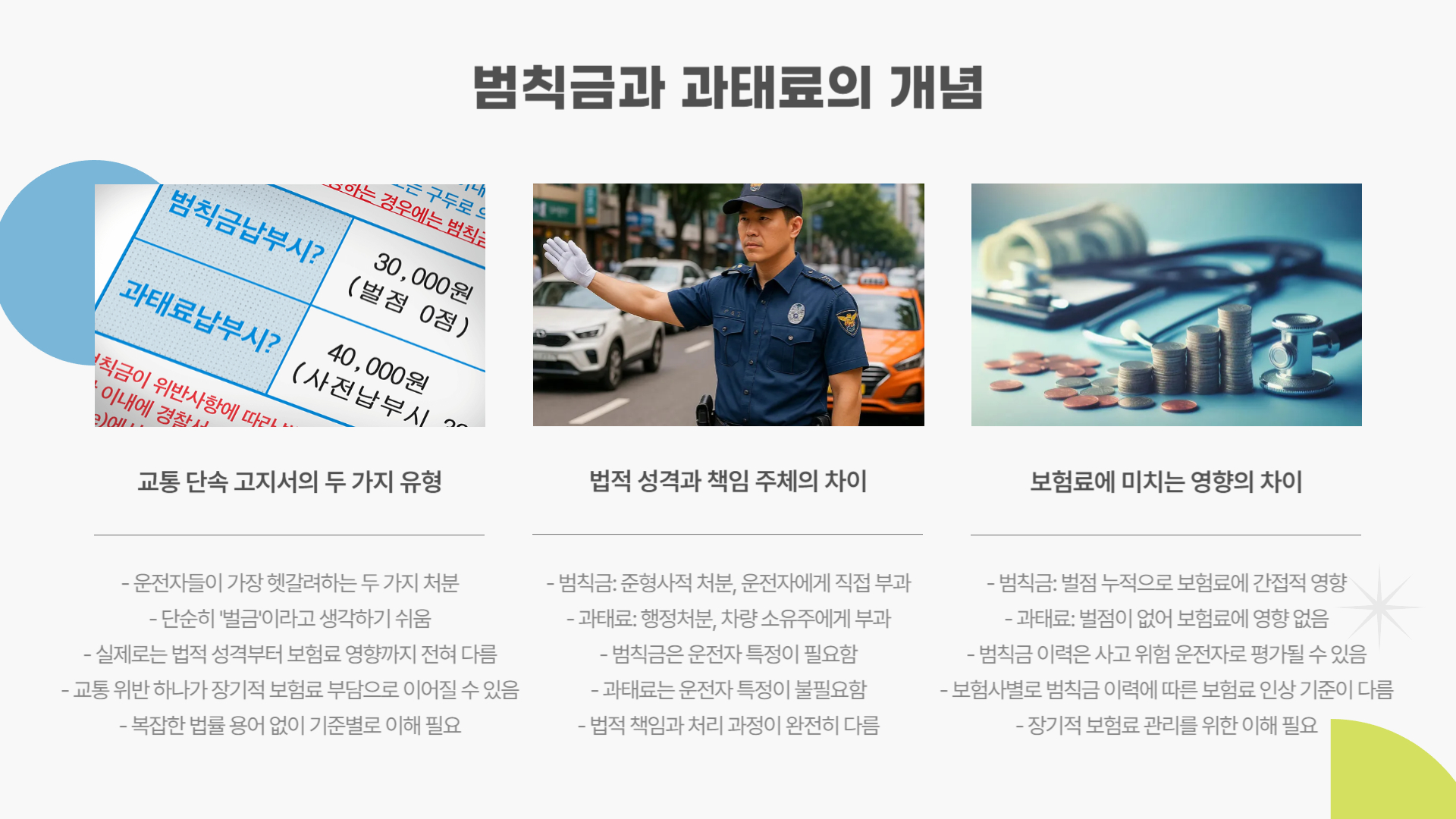 운전을 하다 보면 한 번쯤은 교통 단속 고지서를 받아본 경험이 있을 것입니다. 이때 많은 운전자들이 가장 먼저 헷갈려하는 것이 바로 범칙금과 과태료의 차이입니다. 금액만 보고 단순히 “벌금”이라고 생각하기 쉽지만, 실제로는 두 제도는 법적 성격부터 책임 주체, 벌점 여부, 면허 관리, 그리고 자동차 보험료에 미치는 영향까지 전혀 다릅니다.