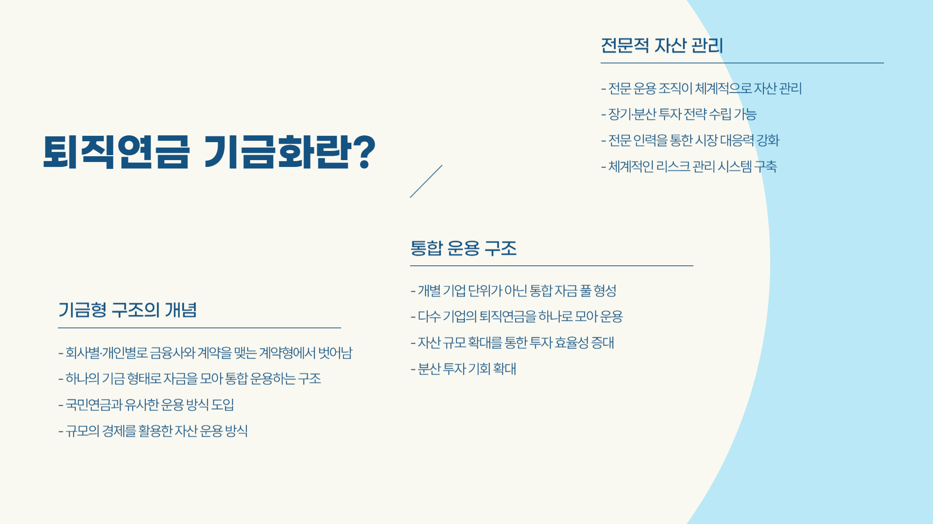 기금형은 이러한 한계를 개선하기 위해 도입이 논의 퇴직연금, 퇴직연금기금화, 퇴직연금제도, 노후준비, 연금개편 되고 있으며, 국민연금처럼 규모의 경제를 활용해 장기·분산 투자를 진행하고 전문 운용 조직이 체계적으로 자산을 관리하는 것이 핵심입니다.