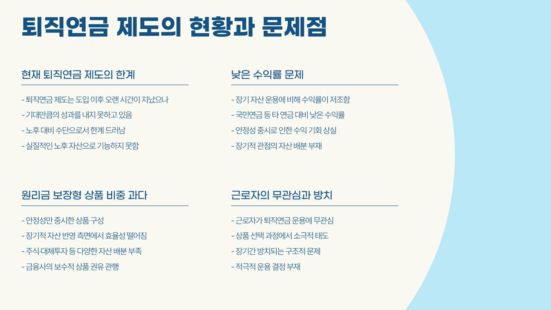 퇴직연금은 노후 소득의 중요한 축이지만, 실제 수익률은 기대에 미치지 못하는 경우가 많습니다. 이는 원리금 보장형 상품 비중이 지나치게 높고, 기업과 근로자 모두 적극적인 운용 결정을 하지 않는 구조 때문입니다.