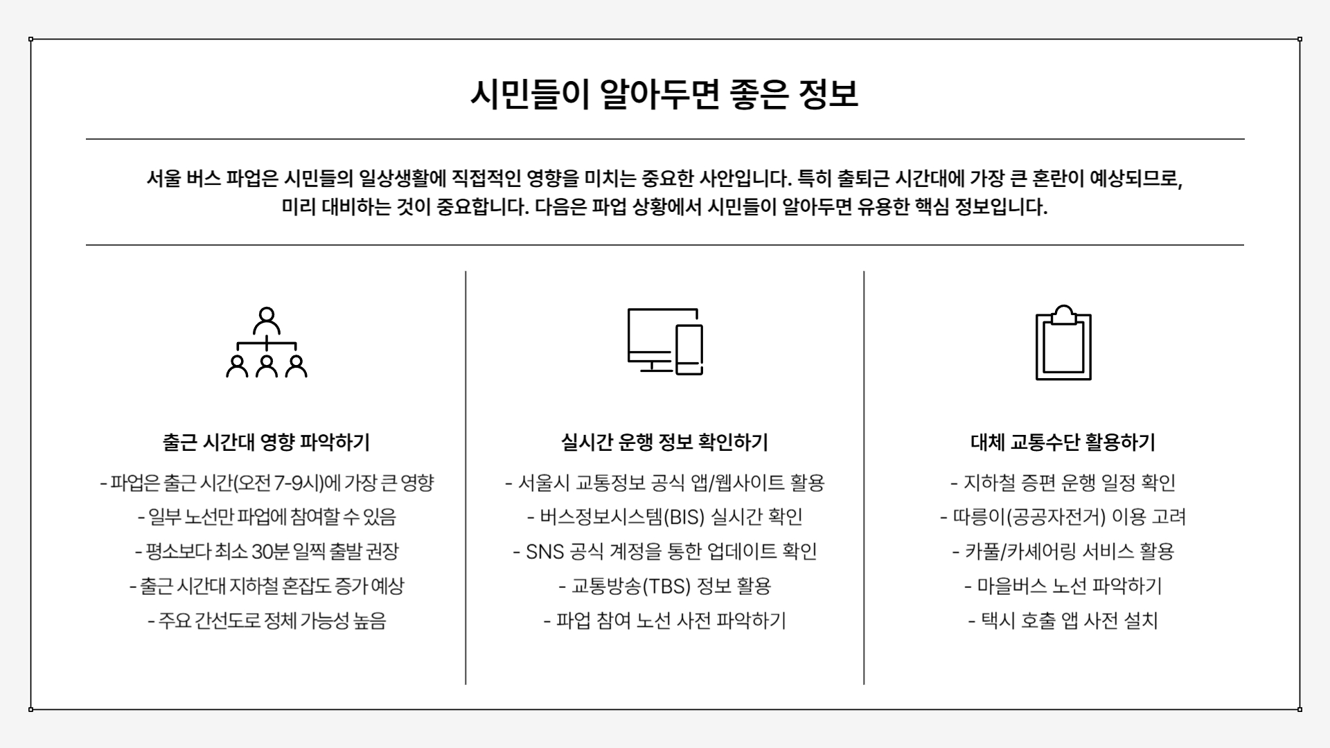 서울버스파업은 단순히 노사 간의 갈등으로만 볼 수 없는, 시민의 일상과 밀접하게 연결된 사회적 이슈입니다. 파업이 발생한 이유를 정확히 이해하면 불필요한 불안이나 과도한 정보 소비를 줄일 수 있고, 종료 시점이 유동적이라는 점을 인지하면 보다 현실적인 대비가 가능합니다. 당분간은 파업 상황이 수시로 변동될 가능성이 있는 만큼, 공식 발표와 실시간 교통 정보를 중심으로 확인하면서 지하철이나 다른 대체 교통수단을 병행하는 전략적인 접근이 필요합니다. 무엇보다 중요한 것은 혼란 속에서도 자신의 이동 계획을 미리 점검하고, 상황 변화에 유연하게 대응하는 것입니다. 정확한 정보 위주로 차분하게 대응하는 것이 가장 현명한 방법이라 할 수 있겠습니다.