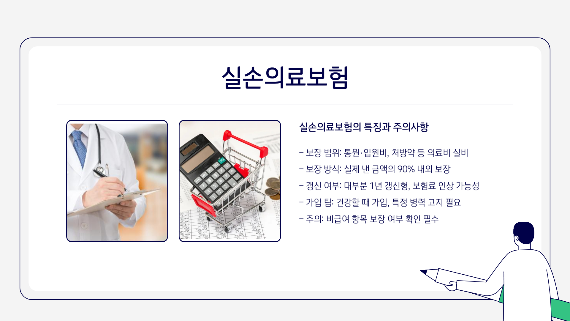 | 실손의료보험 | 병원 치료비 실비 보장 | 갱신 여부, 비급여 항목 확인 필요 |