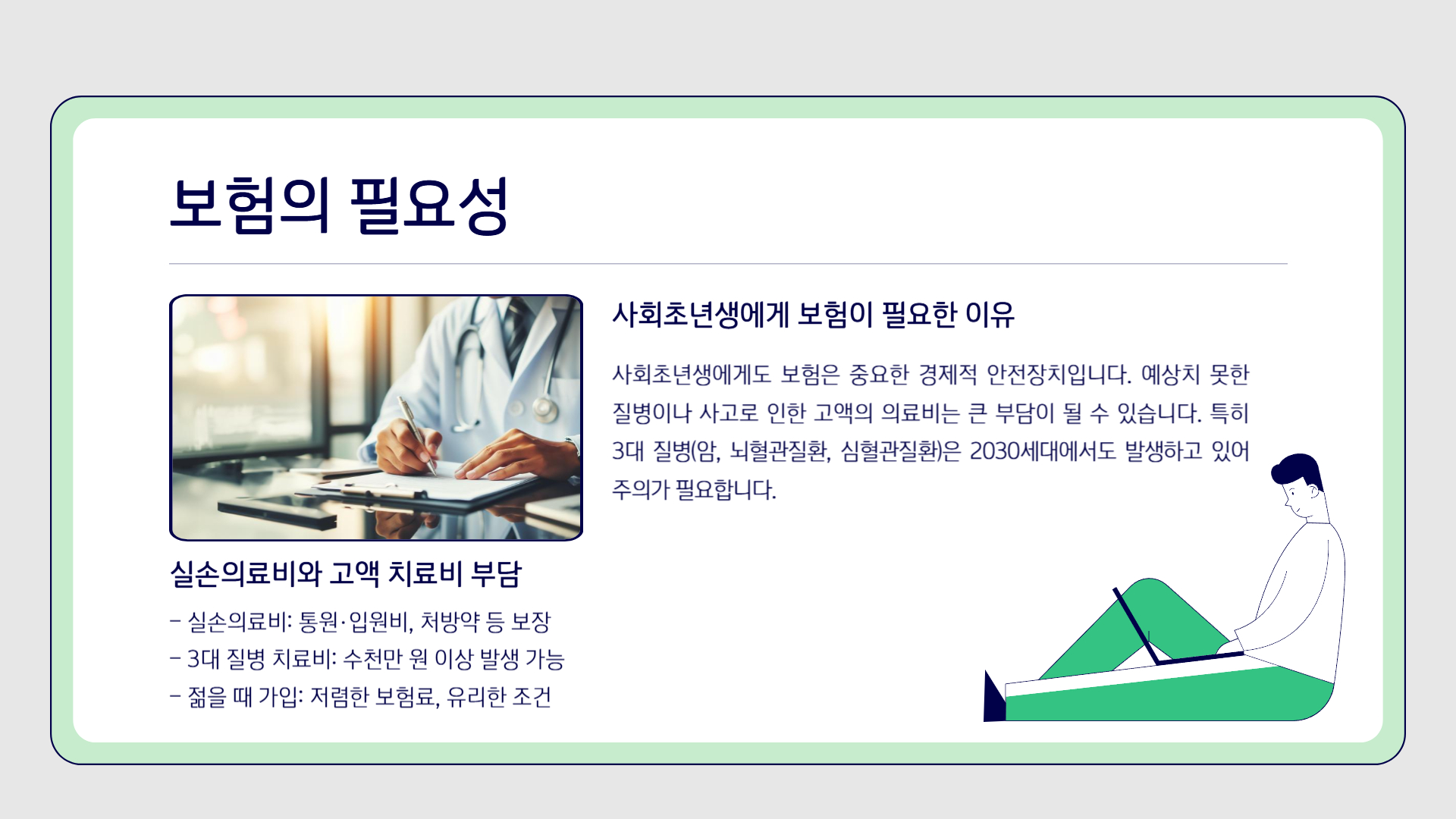 - 특히 암, 뇌혈관질환, 심혈관질환은 2030세대에서도 꾸준히 발생 중이며, 치료비가 수천만 원에 달하기도 합니다.