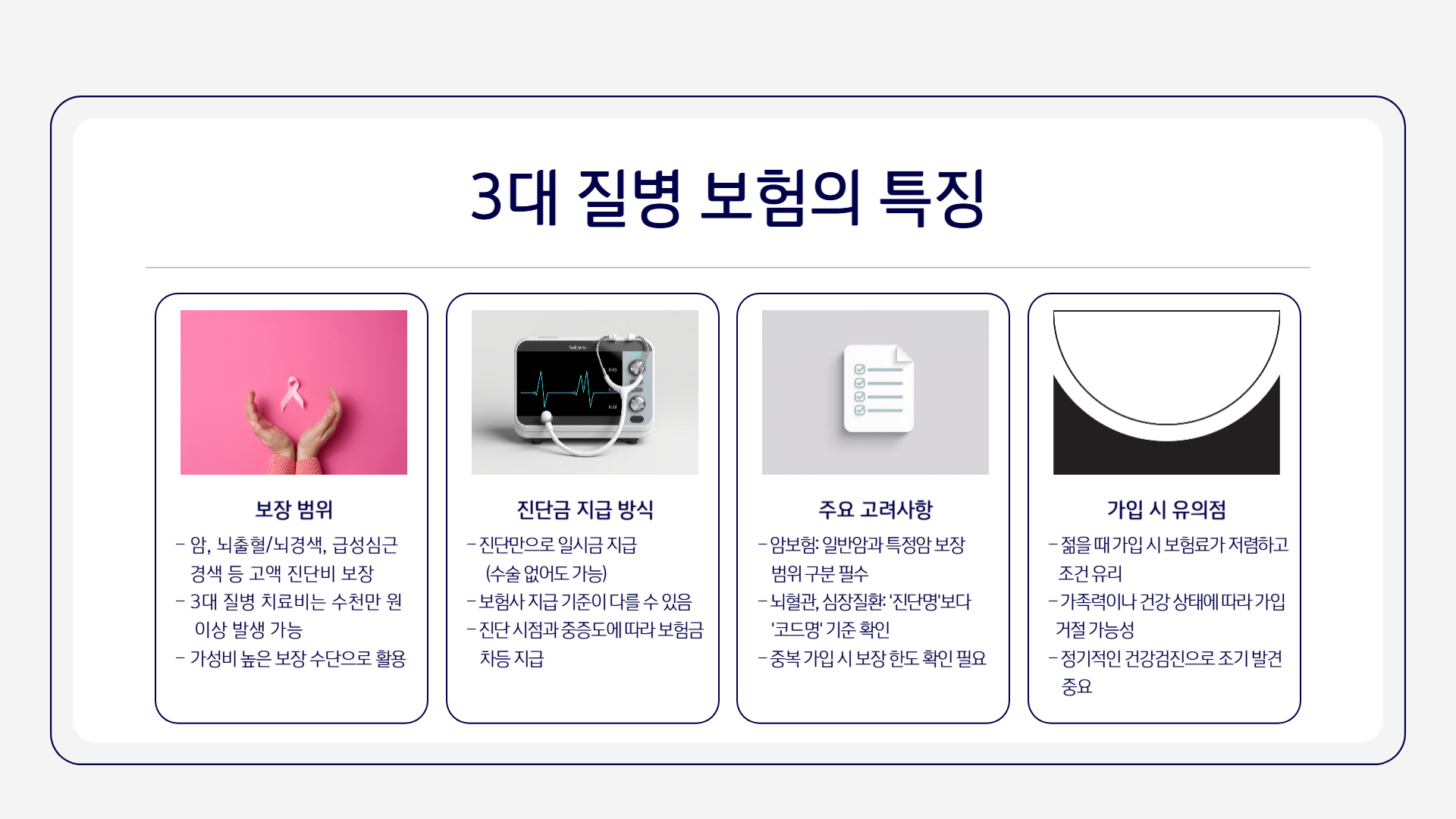 - 3대 질병 치료비는 수천만 원 이상 발생할 수 있어 가성비 보장 수단