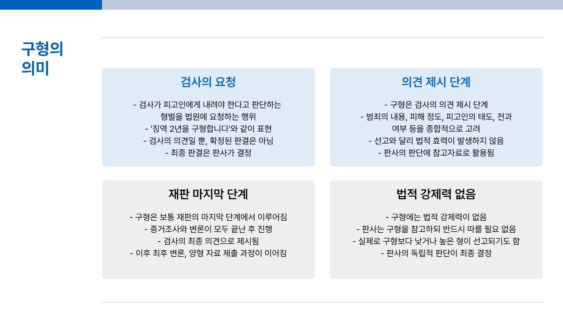 구형은 보통 재판의 마지막 단계에서 이루어지며, 검사는 범죄의 내용, 피해 정도, 피고인의 태도, 전과 여부 등을 종합해 형량을 제시합니다. 중요한 점은 구형에는 법적 강제력이 없다는 것입니다.