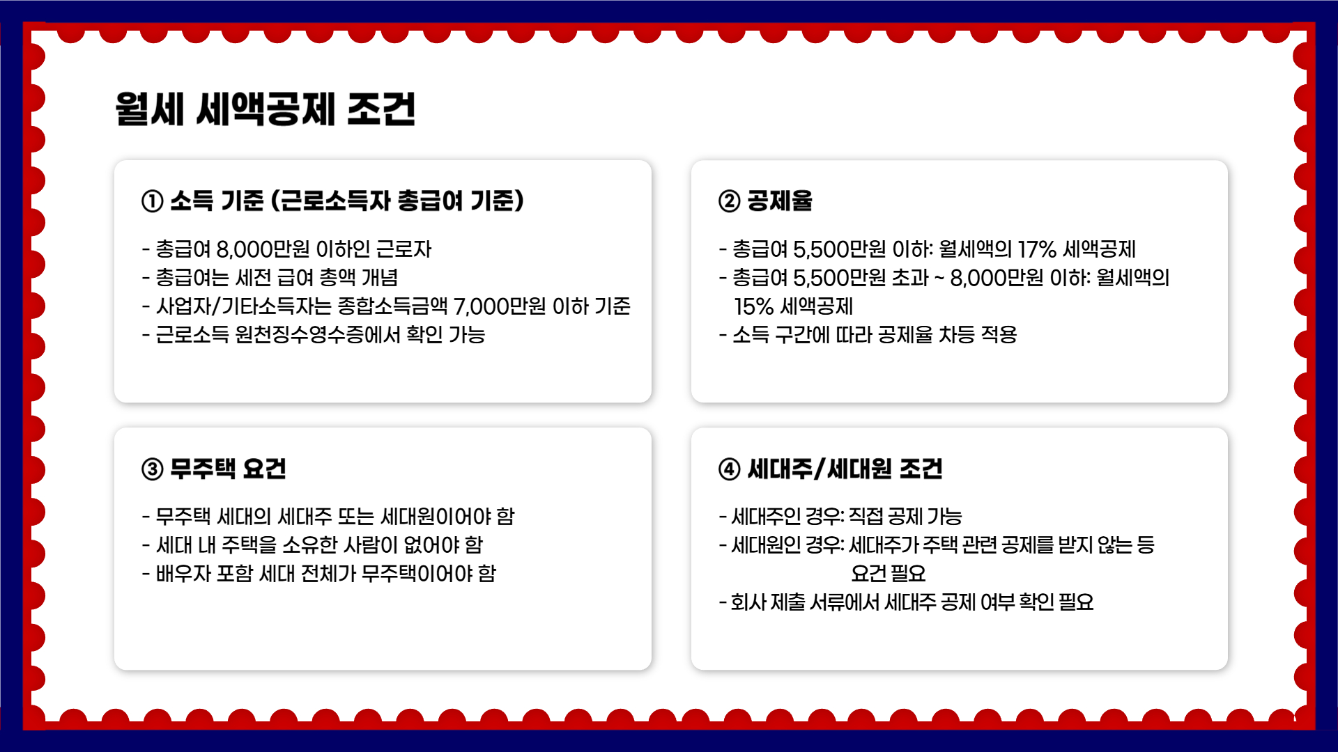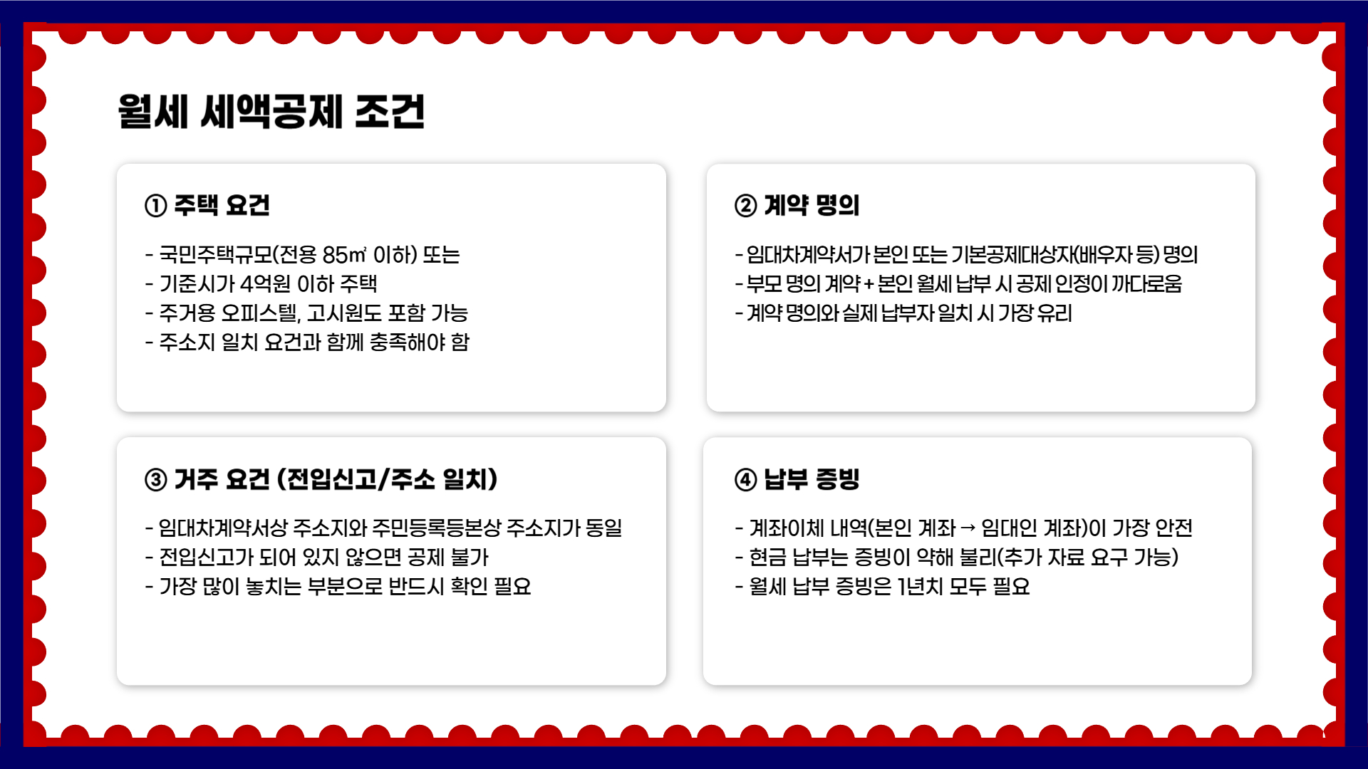- 임대차계약서가 ‘본인 또는 기본공제대상자(배우자 등)’ 명의로 되어 있어야 유리합니다.