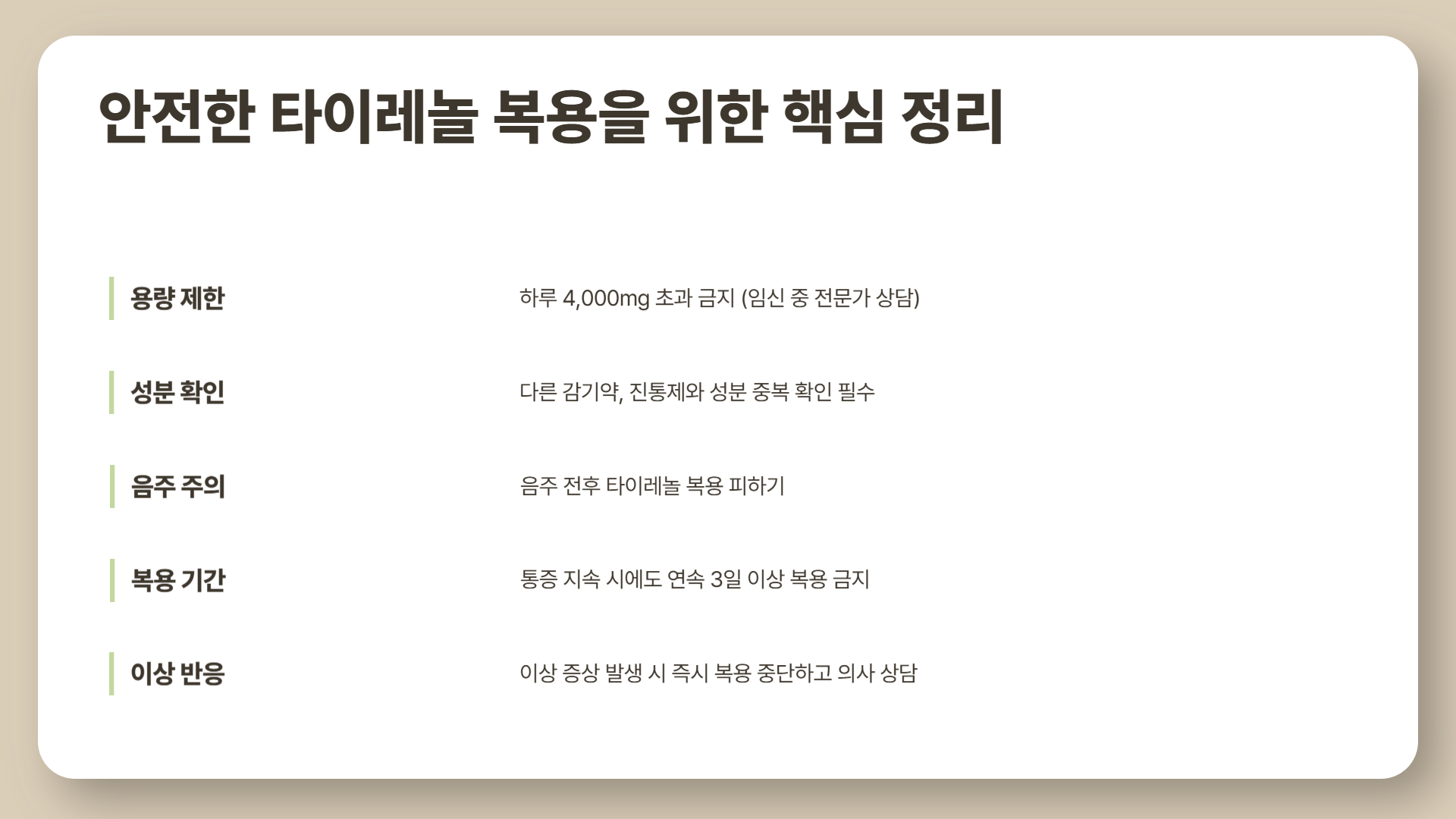 특히 매일 술을 마시는 습관이 있다면, 최신 권고 기준에서는 타이레놀 사용 자체를 의사 상담 후 결정하도록 안내하고 있습니다.