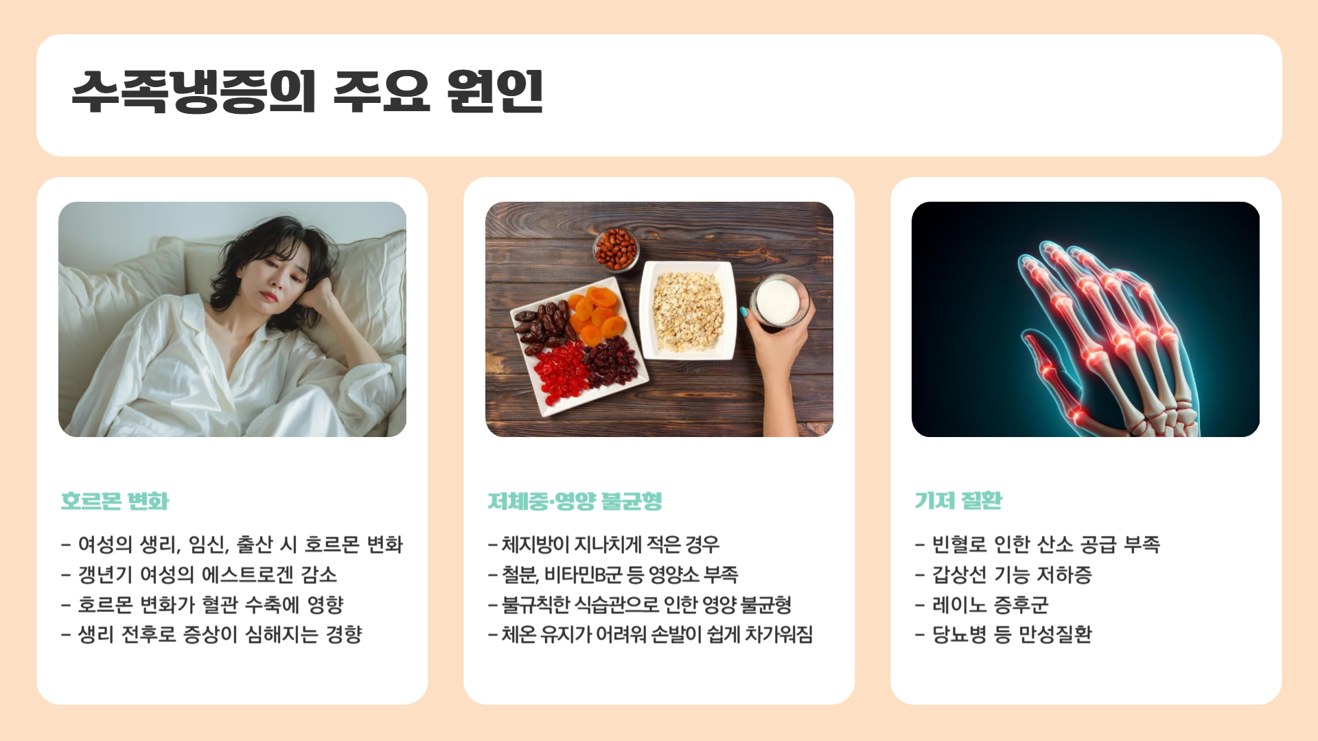 수족냉증은 단일 원인보다는 여러 요인이 복합적으로 작용하는 경우가 많습니다.