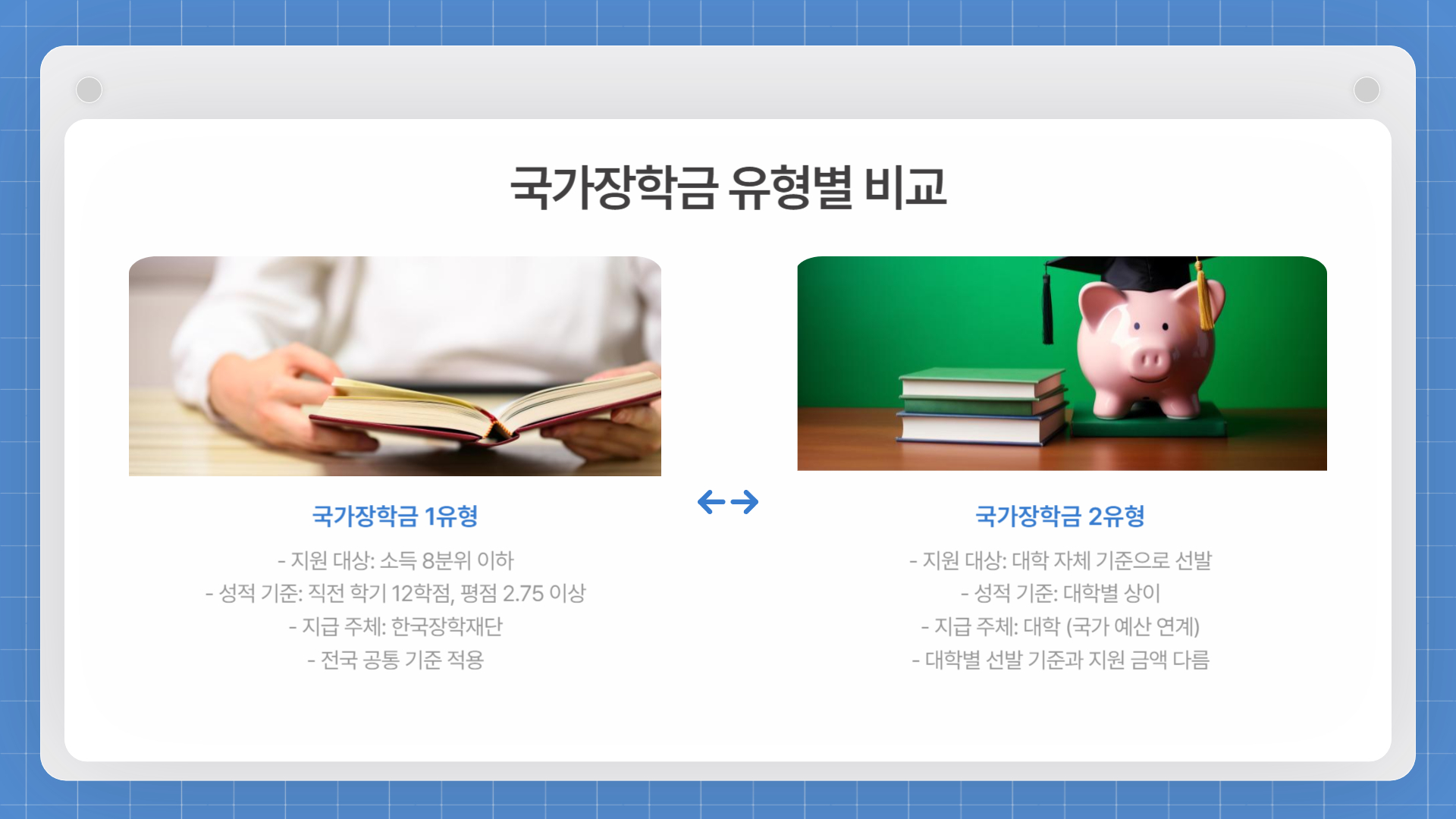 국가장학금은 한국장학재단에서 소득 수준에 따라 지급하는 대표적인 등록금 지원 제도입니다. 크게 1 유형과 2 유형으로 나뉘며, 지원 대상과 방식에 차이가 있습니다.