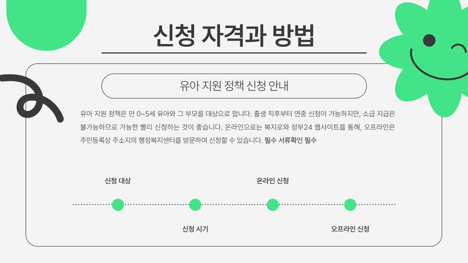 - 신청 시기: 출생 직후부터 연중 신청 가능