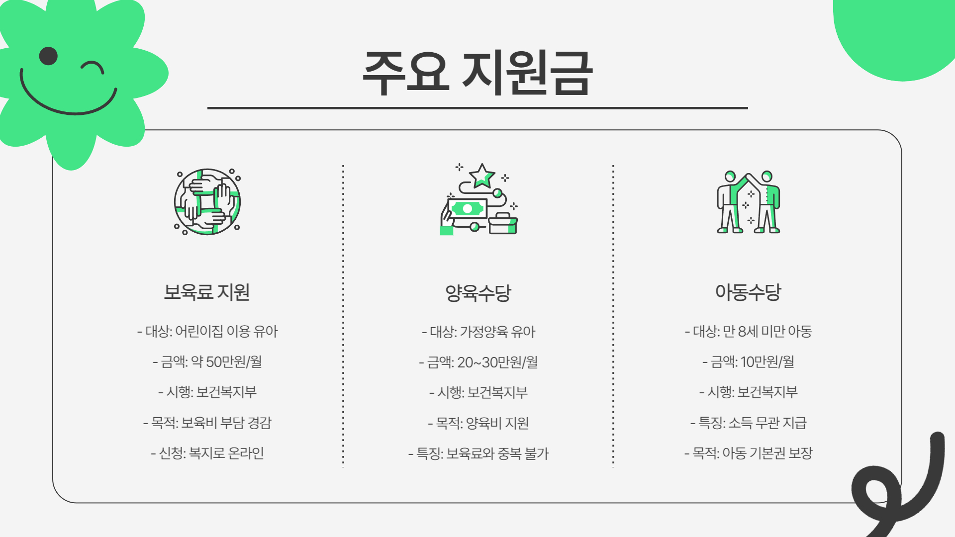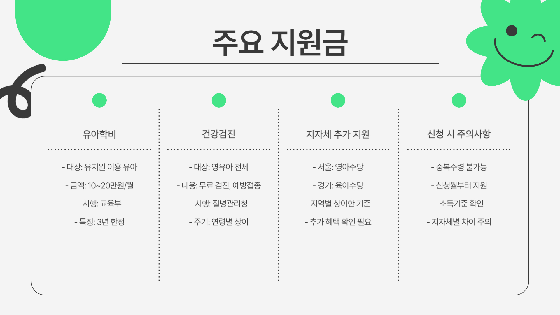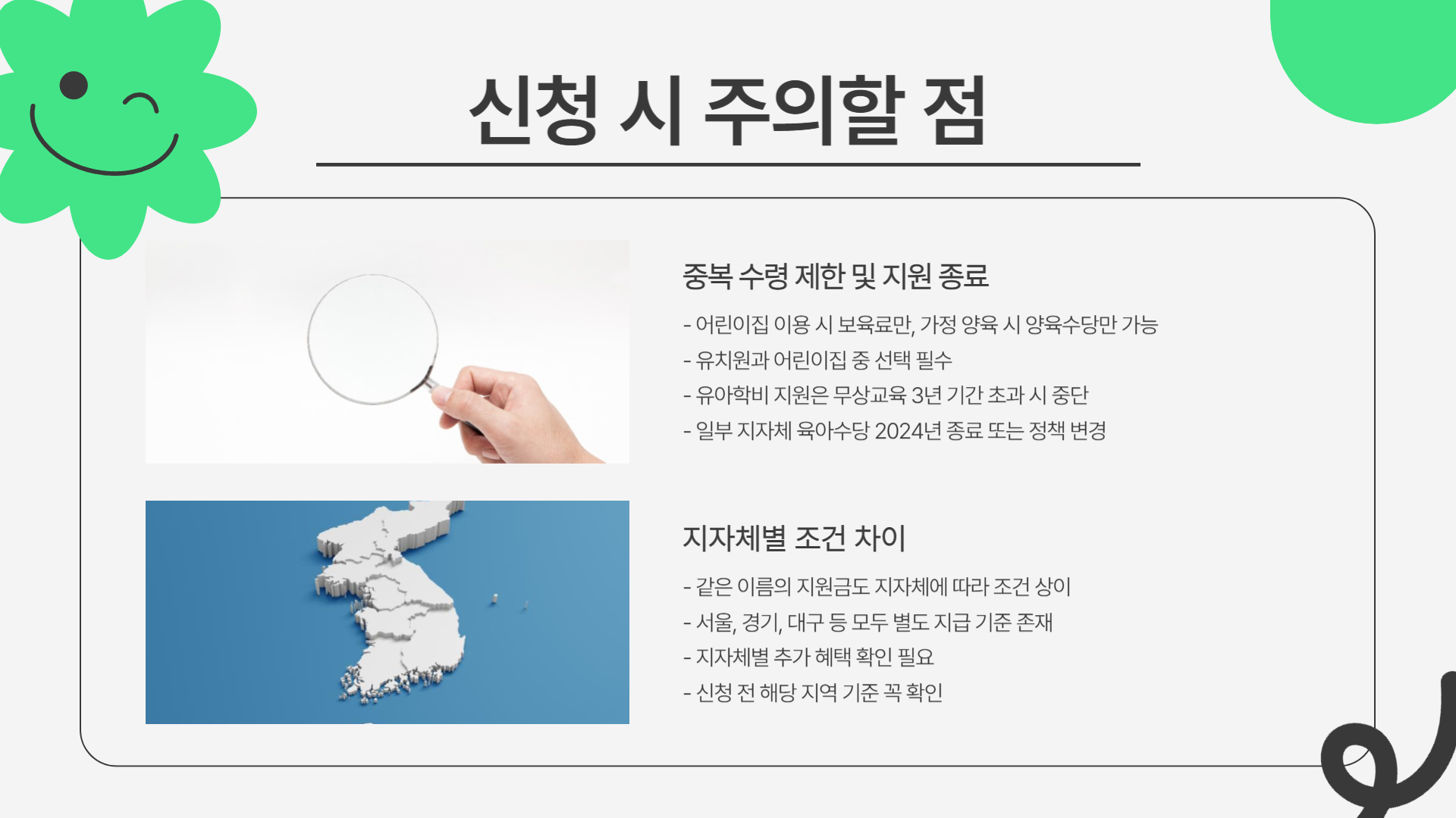 - 지자체 별 추가 혜택 존재 (예: 서울시 영아수당, 경기형 육아수당)