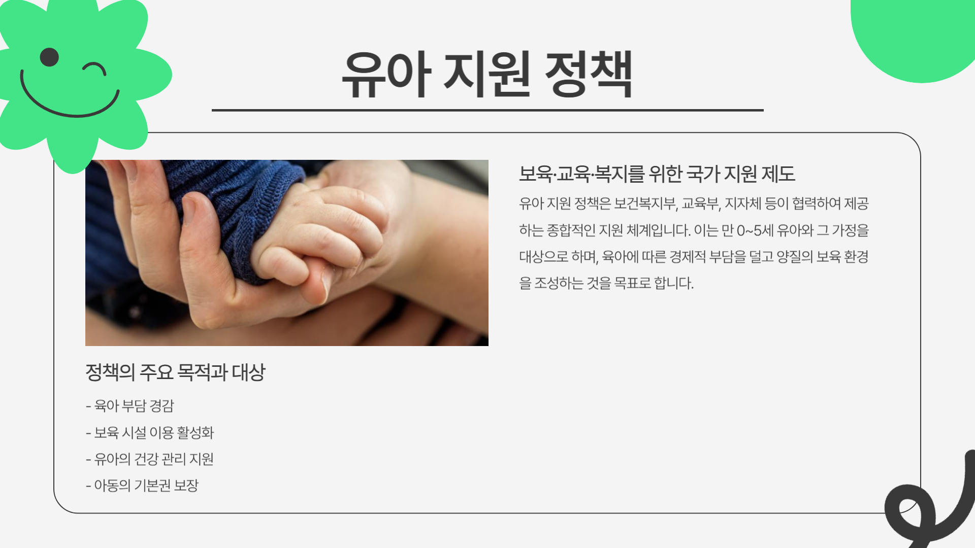보건복지부, 교육부, 지자체 등이 만 0~5세 유아를 대상으로 제공하는 보육·교육·복지 지원 제도를 총칭합니다.