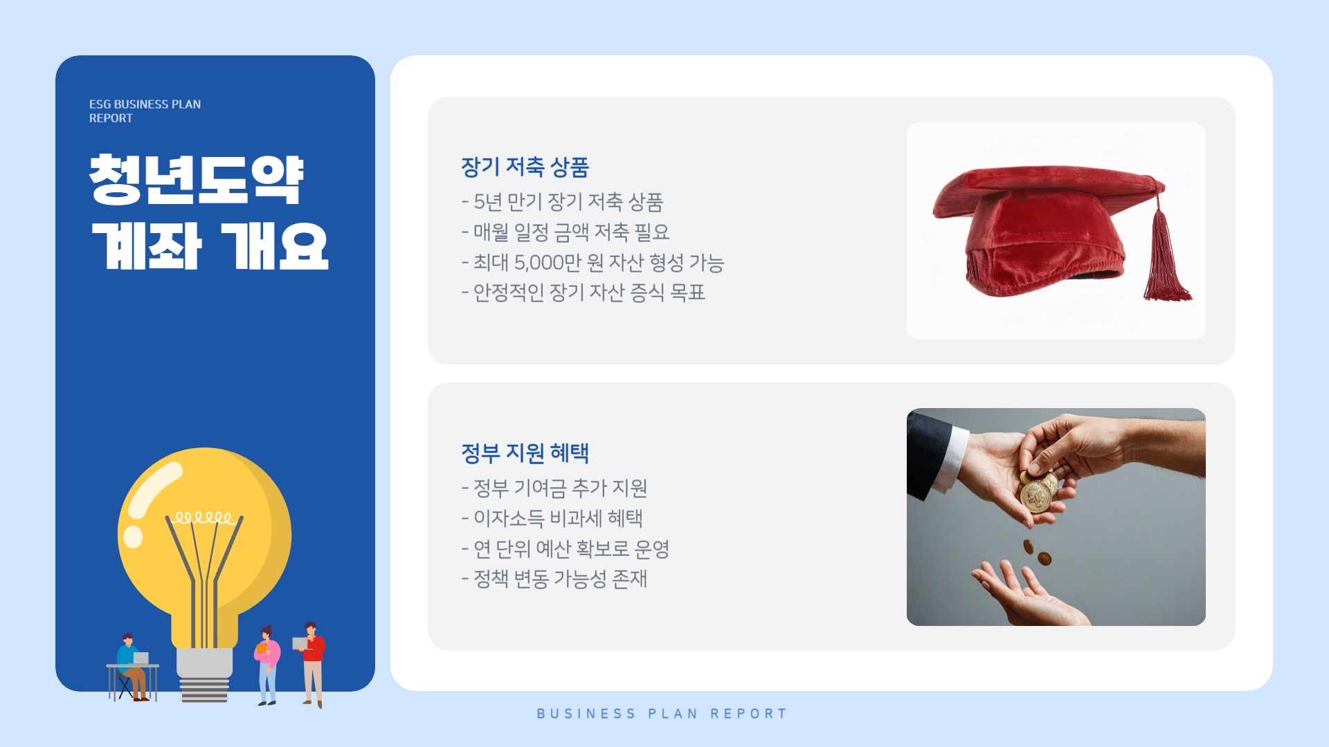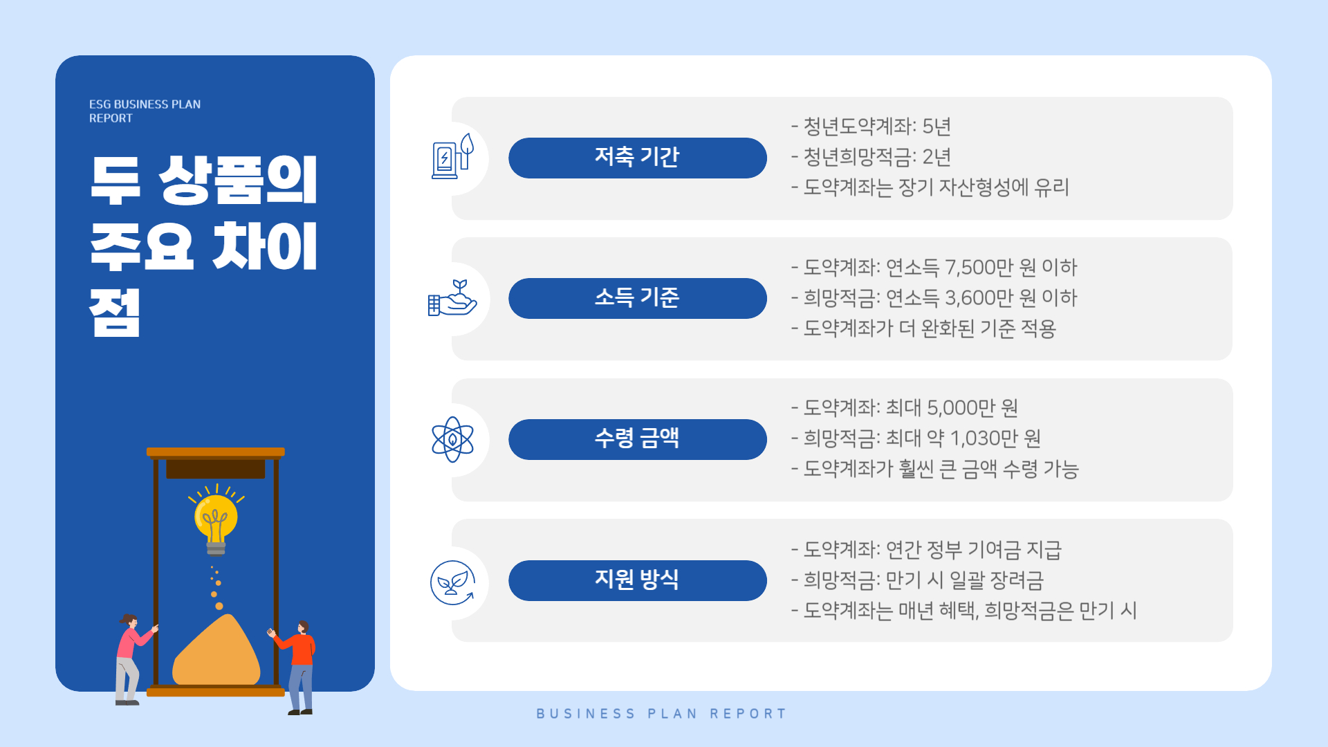 – 지원 방식: 도약계좌는 연간 기여금, 희망적금은 만기 일괄 장려금