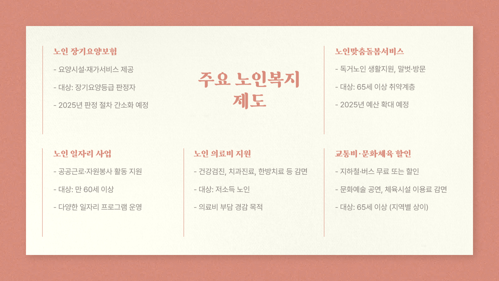 | 노인맞춤돌봄서비스 | 독거노인 생활지원, 말벗·방문 | 65세 이상 취약계층 |