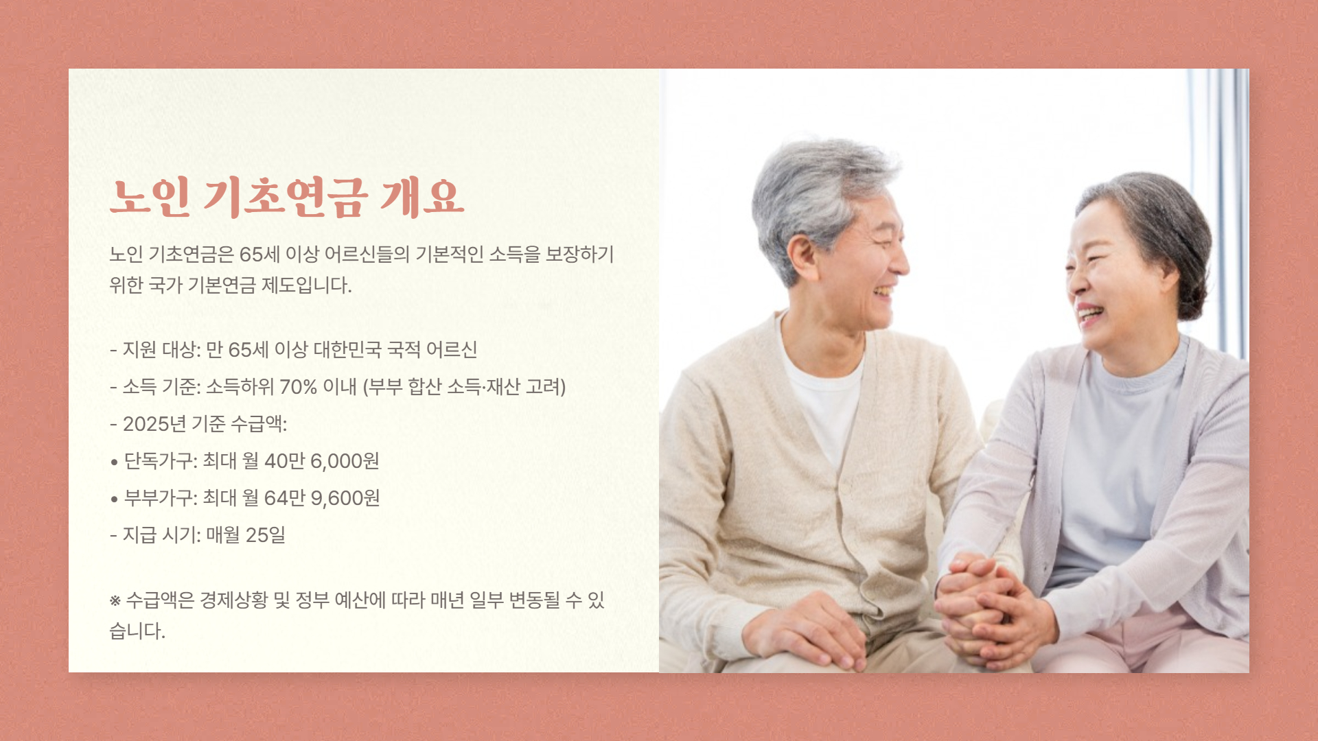 노인 기초연금은 65세 이상 어르신들의 기본적인 소득을 보장하기 위해 정부에서 지급하는 국가 기본연금 제도입니다.