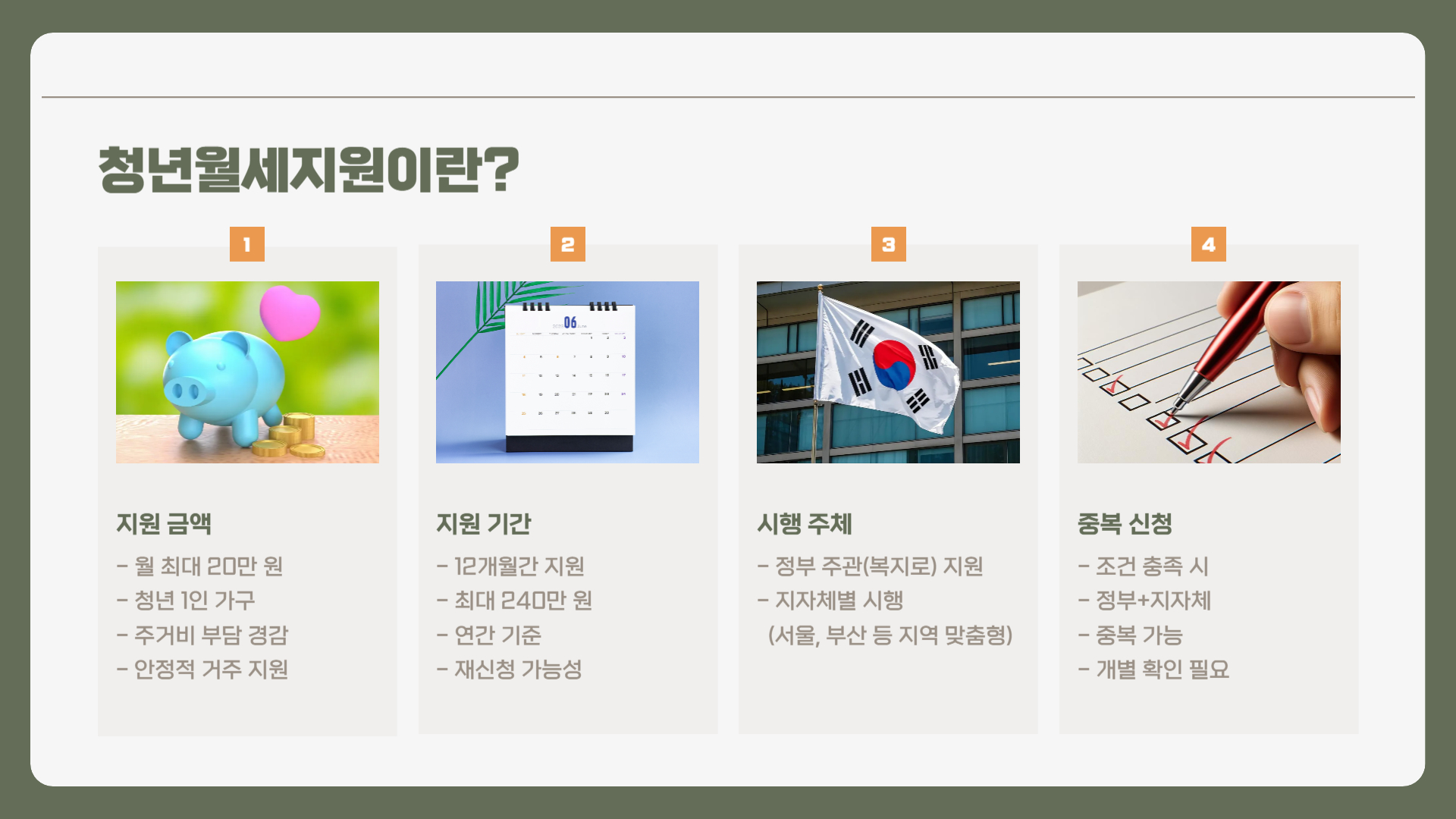 청년 1인 가구가 안정적으로 거주할 수 있도록 월 최대 20만 원을 12개월간(최대 240만 원) 지원하는 제도입니다. 정부 및 지자체가 각각 시행하며, 조건만 맞으면 중복 신청도 가능한 경우가 있습니다.