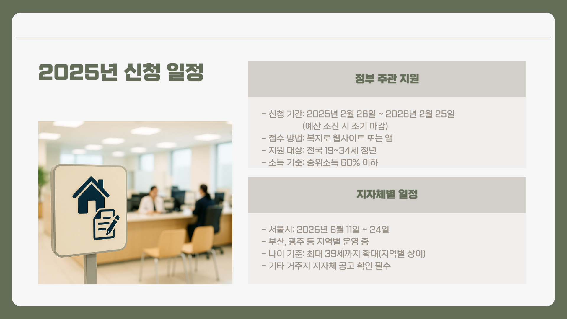 - 정부 주관 지원: 2025년 2월 26일부터 2026년 2월 25일까지 신청 가능 (복지로)