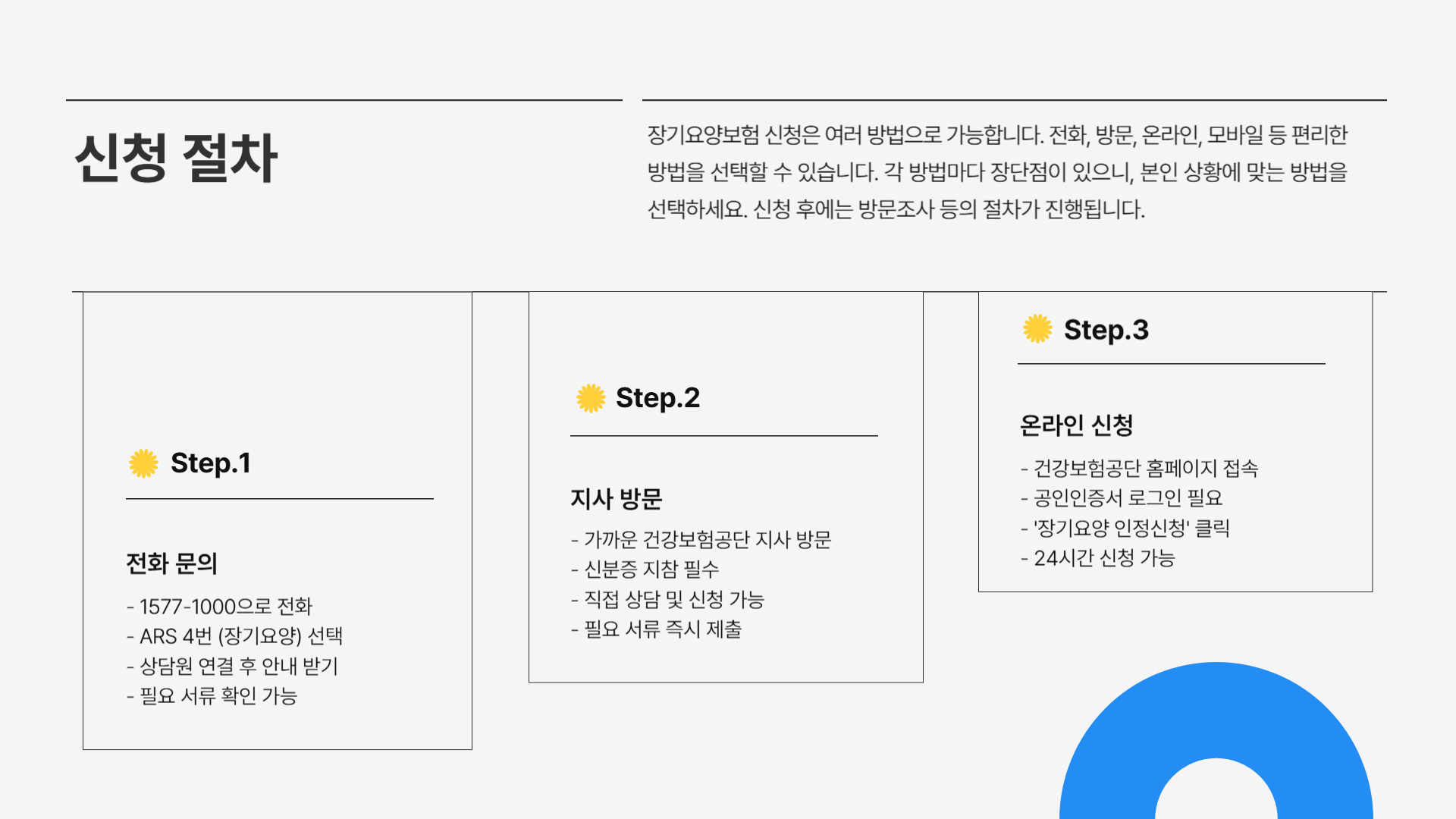 장기요양보험을 이용하려면 먼저 국민건강보험공단에 장기요양 인정 신청을 해야 합니다. 아래 절차에 따라 진행됩니다: