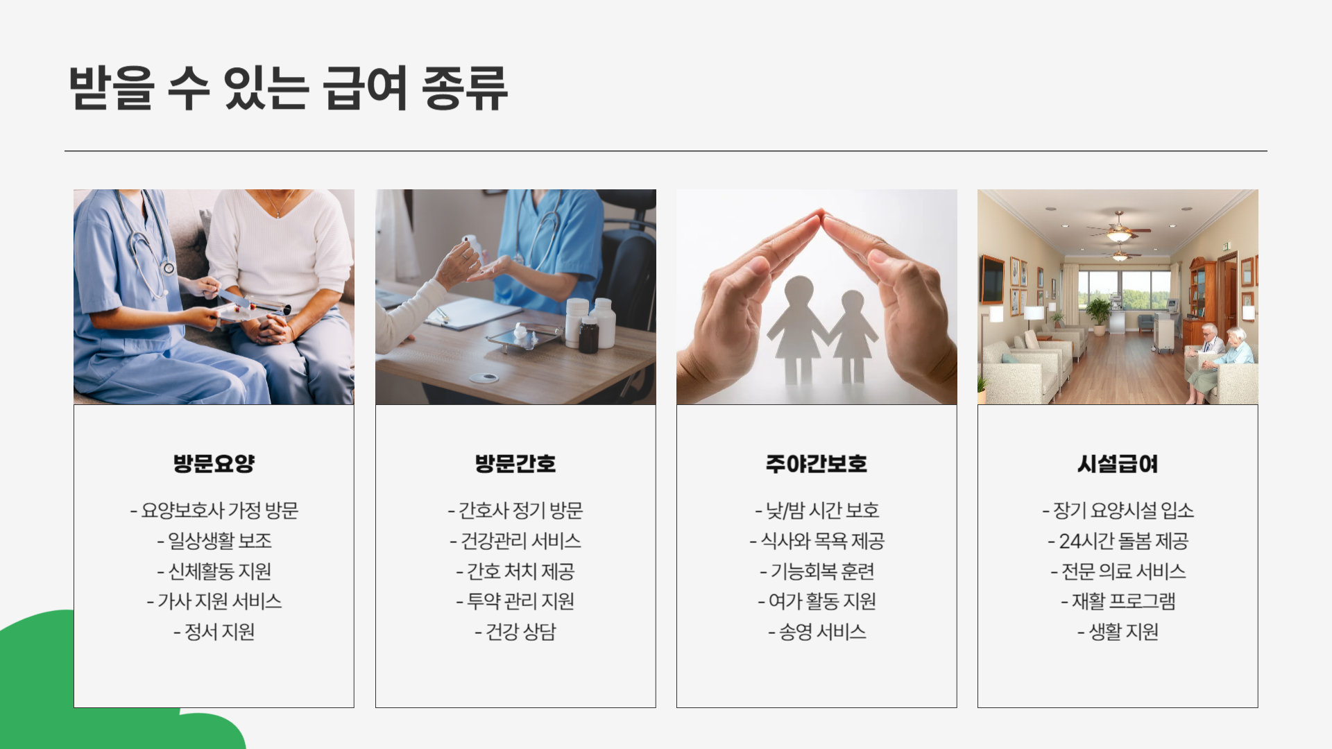 | 방문요양 | 요양보호사가 집으로 방문해 일상생활 보조 및 신체활동 지원 |