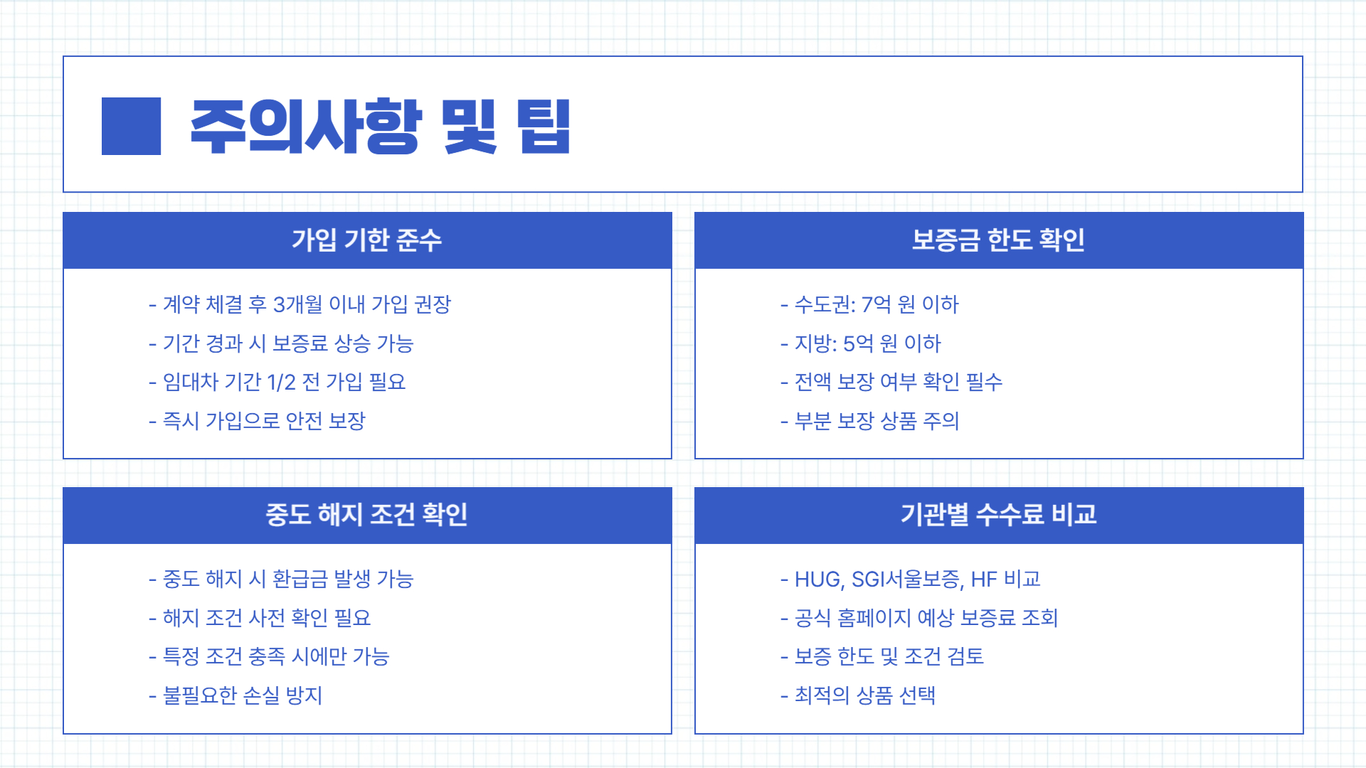 - 보장 범위 꼼꼼히 체크하기: 일부 상품은 부분 보장만 가능합니다.