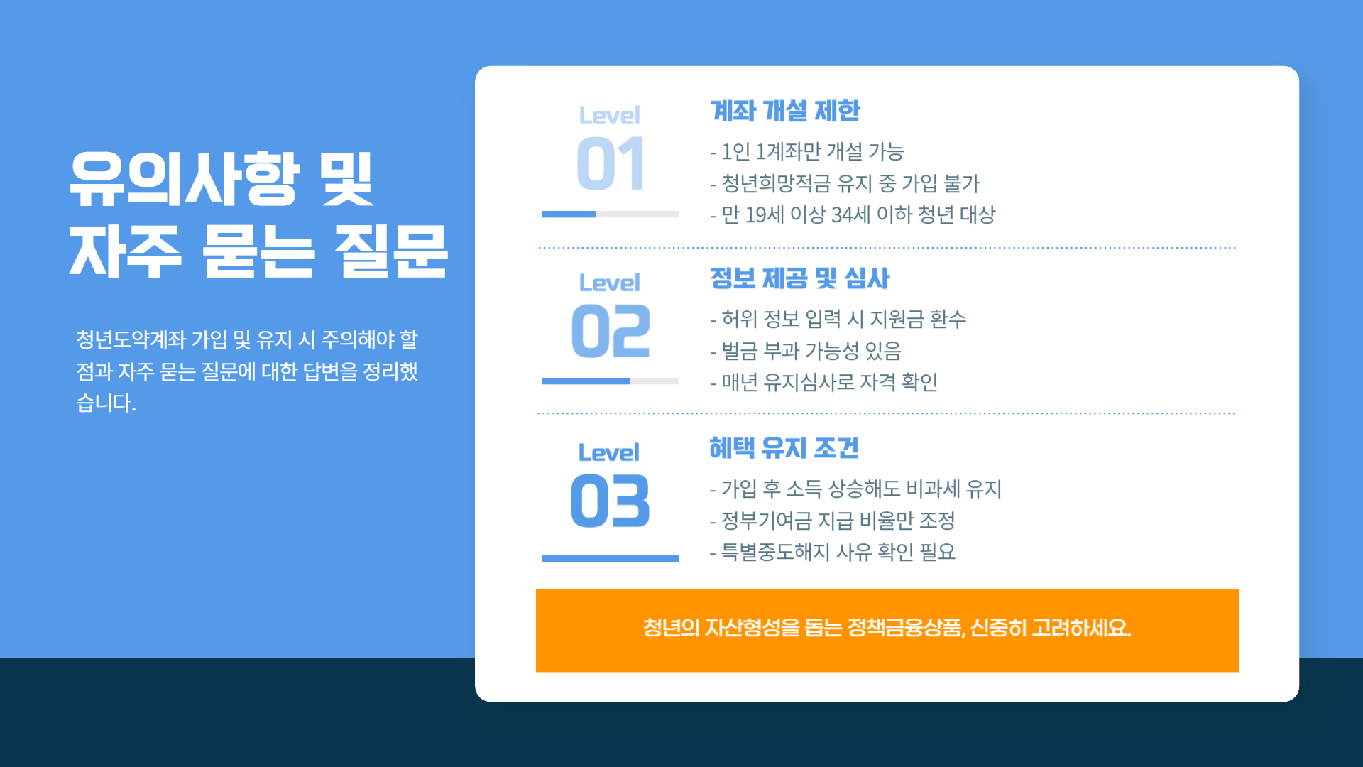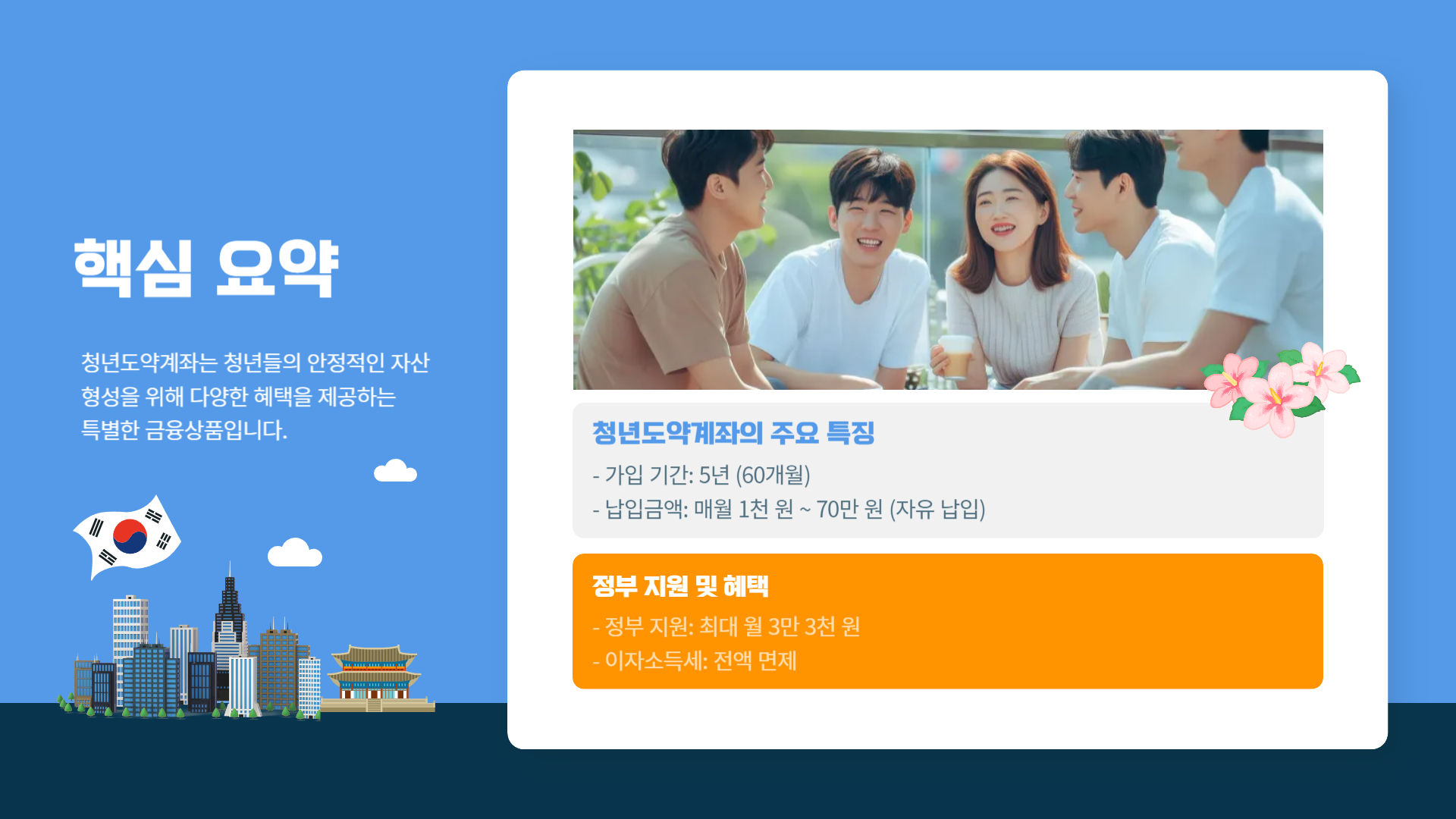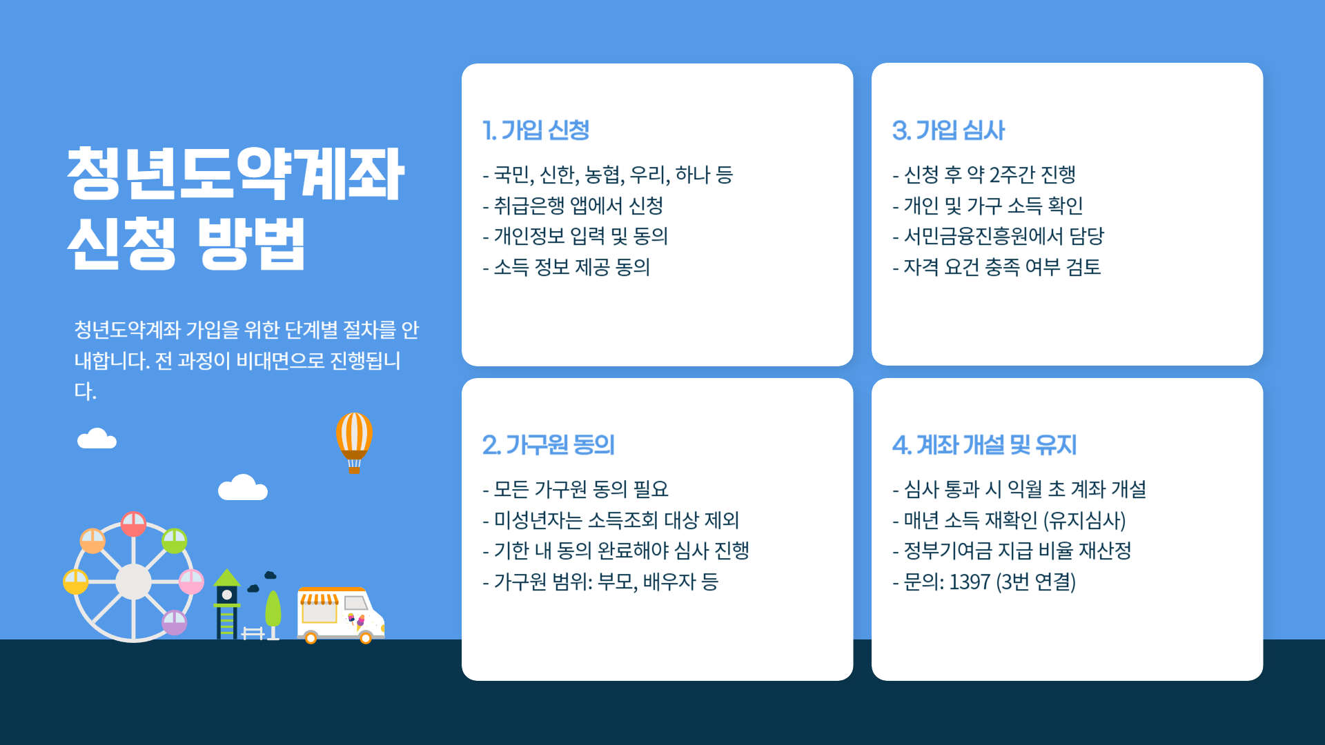 청년도약계좌는 청년들이 5년간 꾸준히 저축하며 정부의 지원금과 비과세 혜택으로 안정적으로 자산을 모을 수 있도록 돕는 금융상품입니다. 가입을 고려 중이신 분들은 취급은행 앱을 통해 빠르게 신청하실 수 있으며, 궁금한 사항은 콜센터(☎1397)로 문의하시길 추천드립니다.