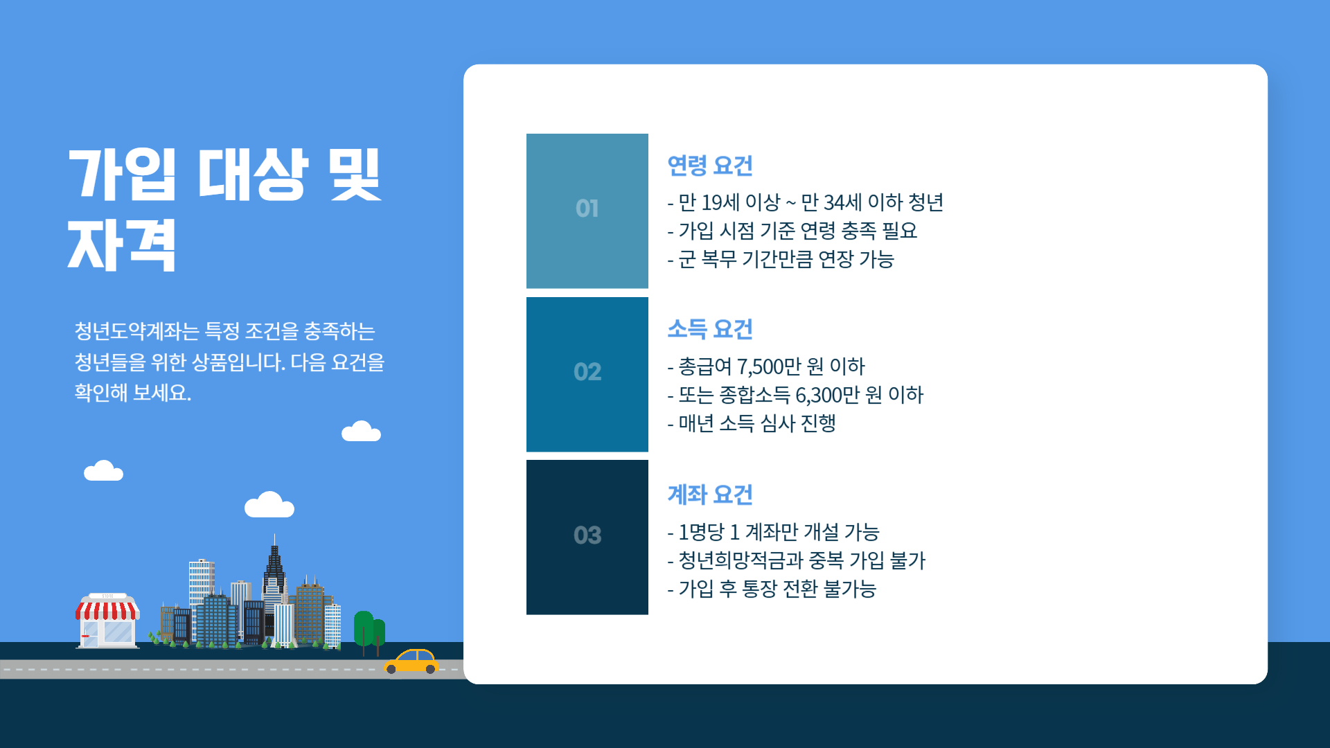청년도약계좌는 다음 조건을 충족해야 가입할 수 있습니다.