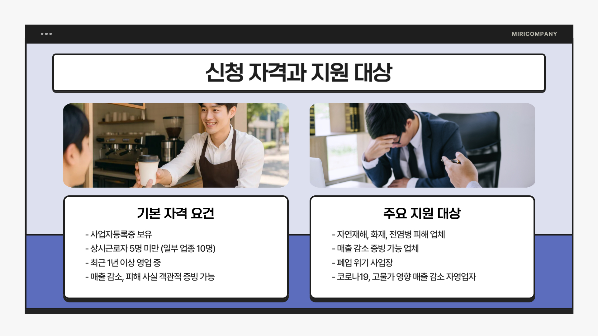 - 자연재해, 화재, 전염병 등으로 경영 피해를 입은 업체