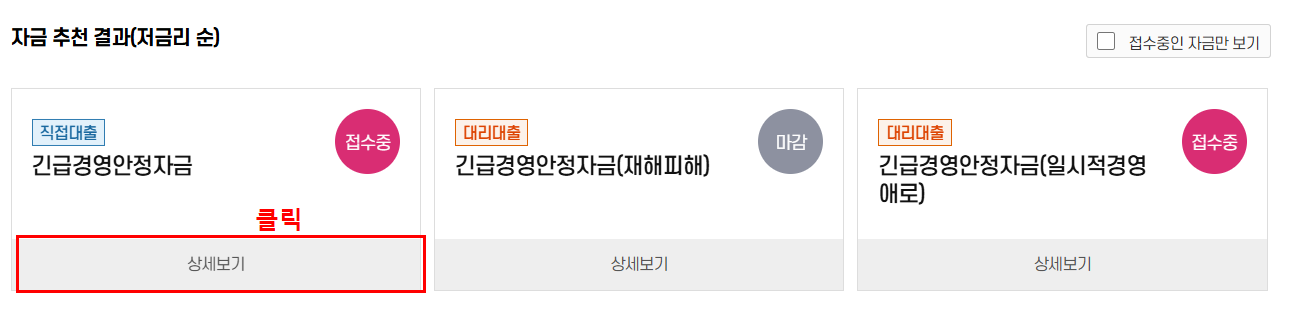 - 정책자금안내 - 맞춤자금 추천 - 키워드 선택(피해업체) - 조회 -> 긴급경영안정자금 상세 보기 클릭