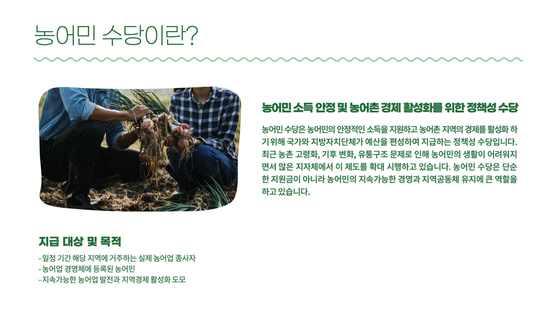 농어민 수당은 농어민의 소득 안정을 지원하고 농어촌 지역의 경제를 활성화하기 위해 국가와 지방자치단체가 예산을 편성하여 지급하는 정책성 수당입니다. 최근 농촌 고령화와 기후 변화, 유통구조 문제로 농어민의 생활이 어려워지면서 많은 지자체에서 농어민 수당을 확대 시행하고 있습니다.